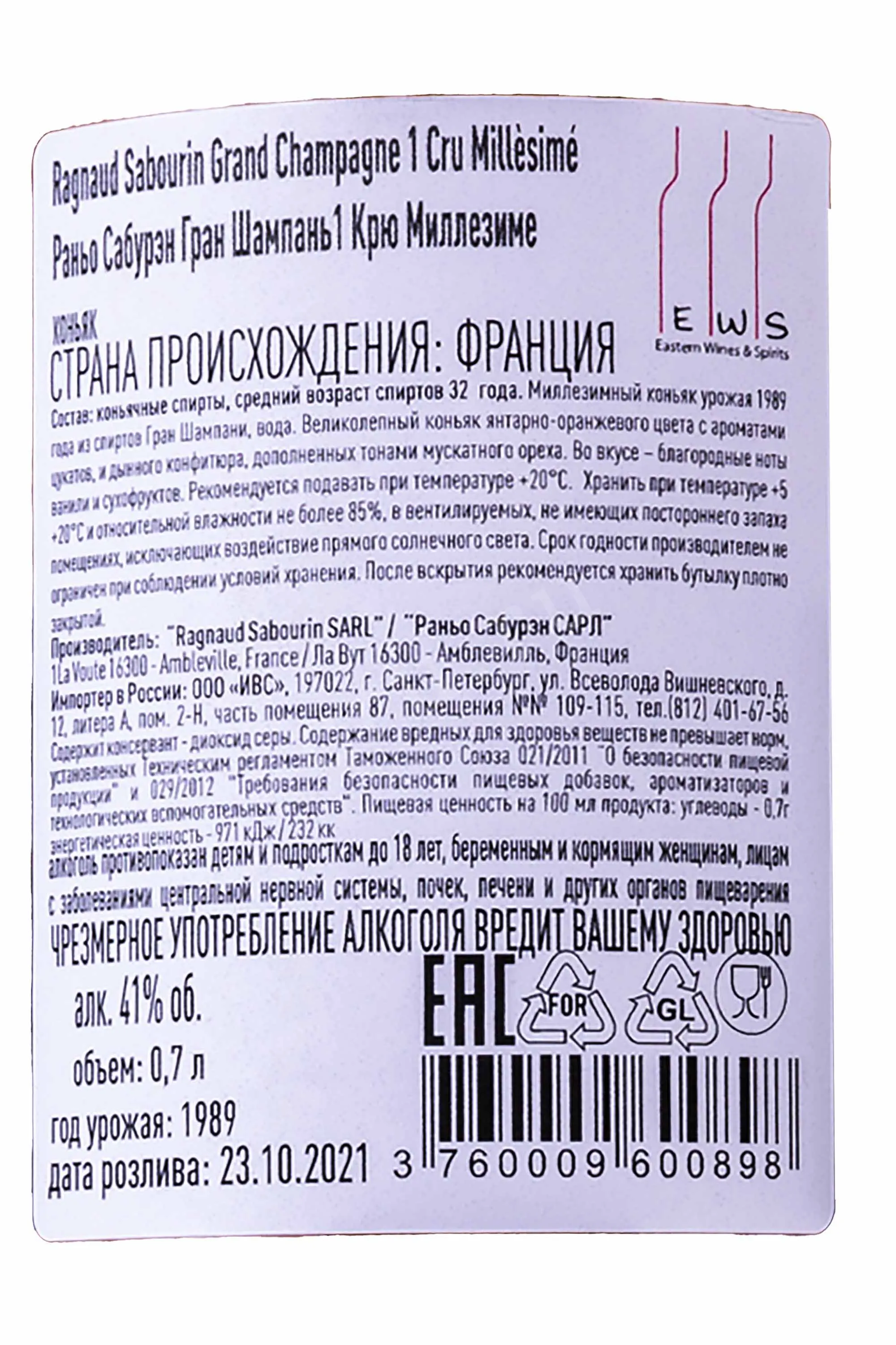 Коньяк Ragnaud Sabourin Millesime 1989 0.7 л – винтажный французский cognac, который изготавливается купажистами старинного коньячного дома Франции – Раньо-Сабуран. Производится из лучшего винограда урожая 1989 года, собранного в популярном регионе провинции Коньяк – Гран Шампань. Высококачественные коньячные дистилляты проходят длительный процесс созревания в лимузенских дубовых бочонках в течение 25 лет, в погребах компании. Эксклюзивный коньяк поставляется в роскошной презентабельной упаковке, станет незабываемым подарком для коллекционера, ценителя и людей 1989 года рождения.