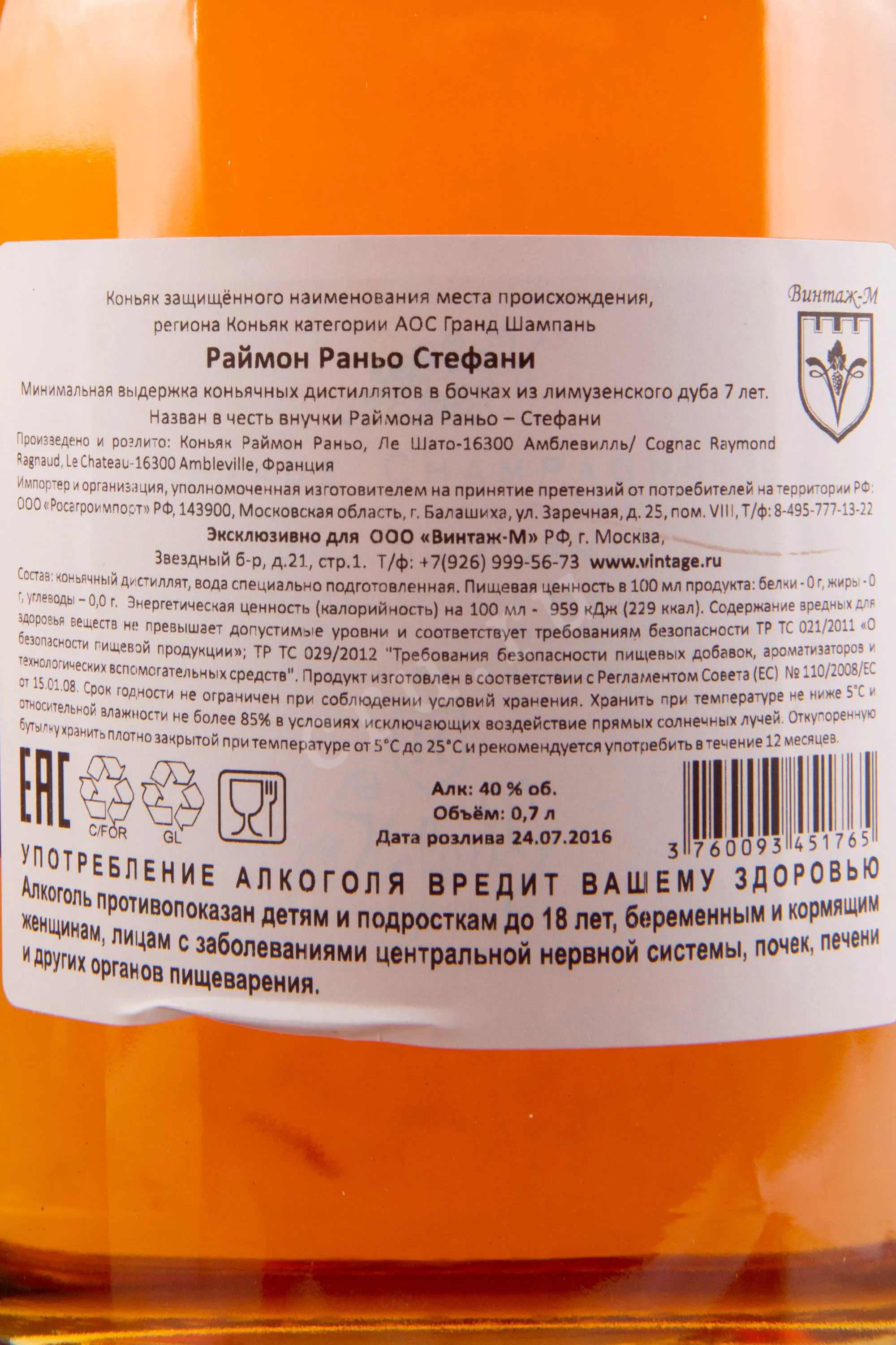 Коньяк Raymond Ragnaud Stefany 0.7 л – элегантный французский cognac, который был назван в честь внучки основателя коньячного дома Раймона Раньо, а также она непосредственно принимала участие в его создании. Производится из лучшего сорта местного винограда, выращенного в регионе провинции Коньяк – Гран Шампань. Отборные коньячные дистилляты высокого качества выдерживаются в лимузенских дубовых бочонках в течение 7 лет, в специальных подвалах компании. Коньяк поступает в изящном декантере и яркой сувенирной упаковке, станет прекрасным подарком на любое торжество.