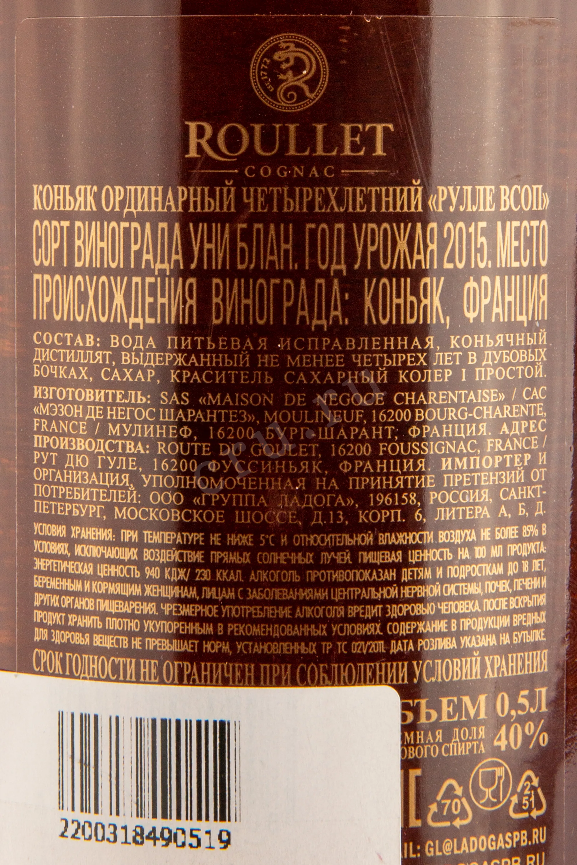 Коньяк Roullet VSOP 0.5 л получил немалое количество наград на выставках в Европе и Азии и был назван лучшим в своей категории экспертами престижного международного конкурса IWSC. Он создан при участии ведущих мастеров знаменитого французского дома Рулле из тщательно отобранных спиртов, самый молодой из которых выдерживался в дубовой бочке 4 года. Сырьем для производства стал сорт Уни Блан с собственных виноградников производителя. В основном использовался урожай 2015 года, который был признан особо удачным.