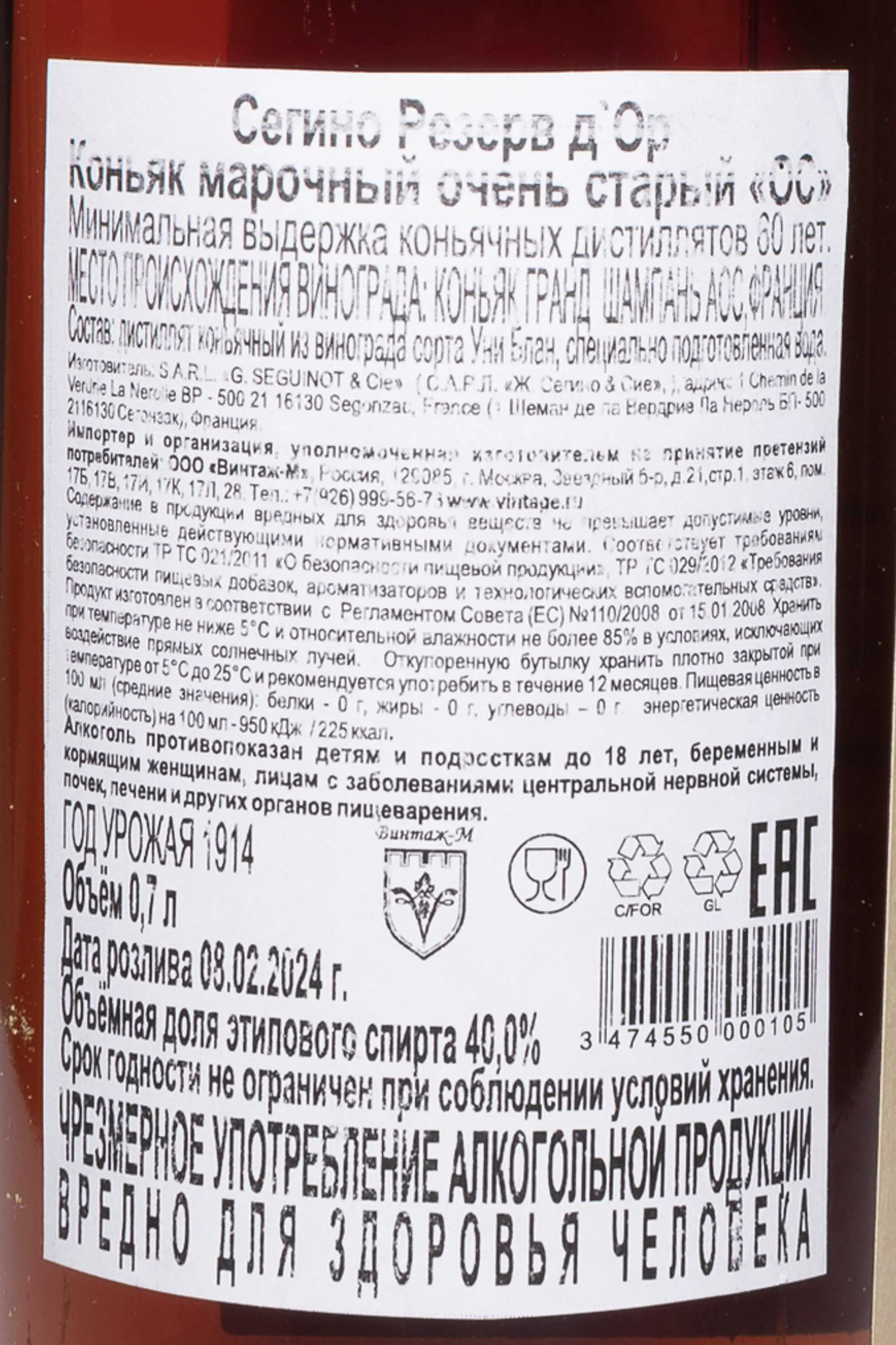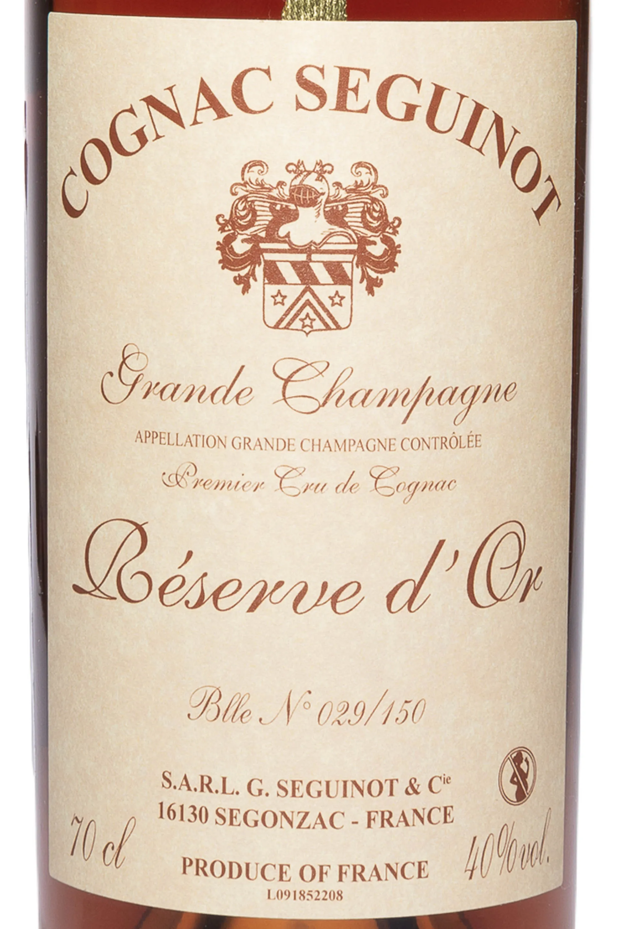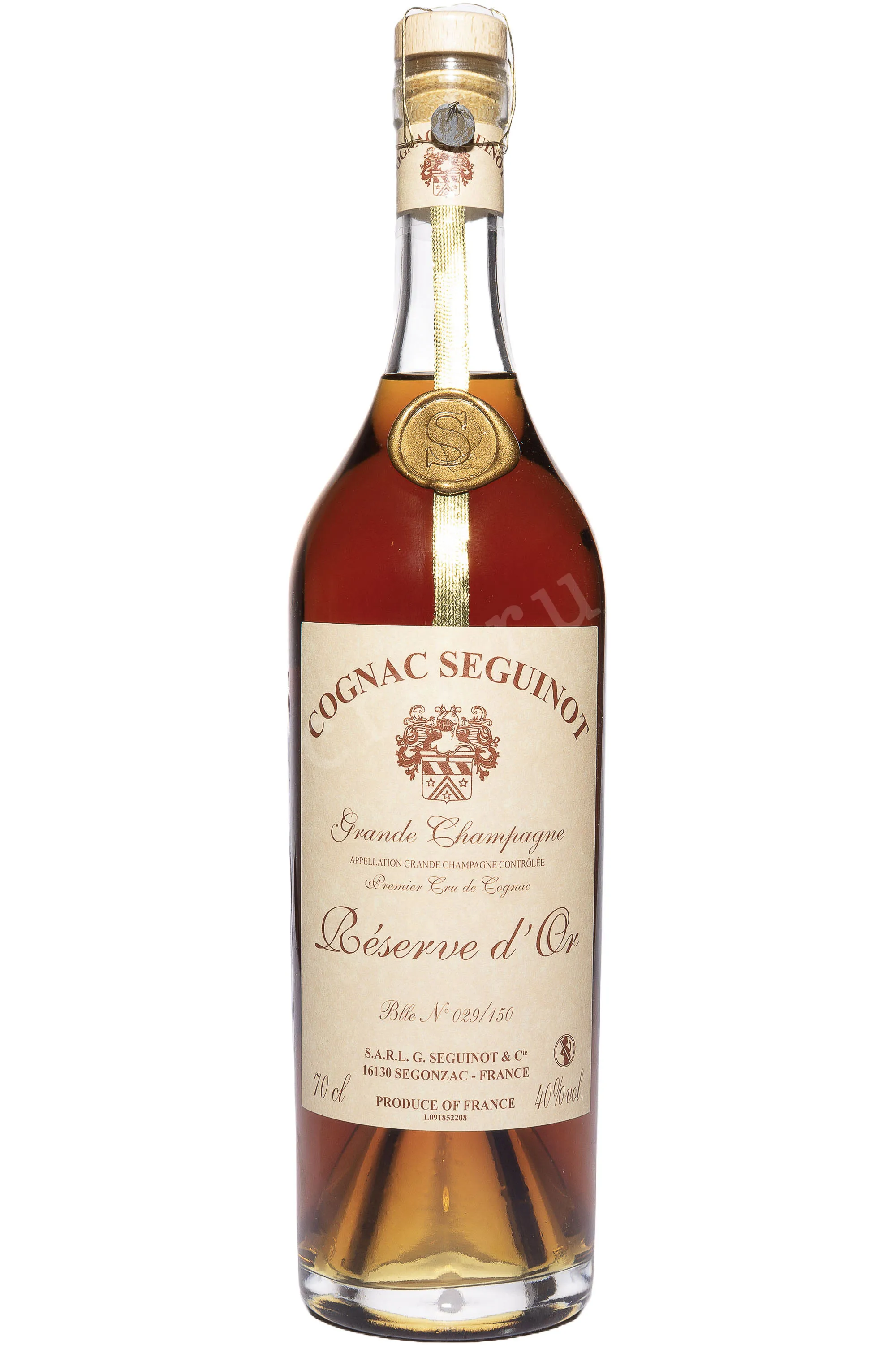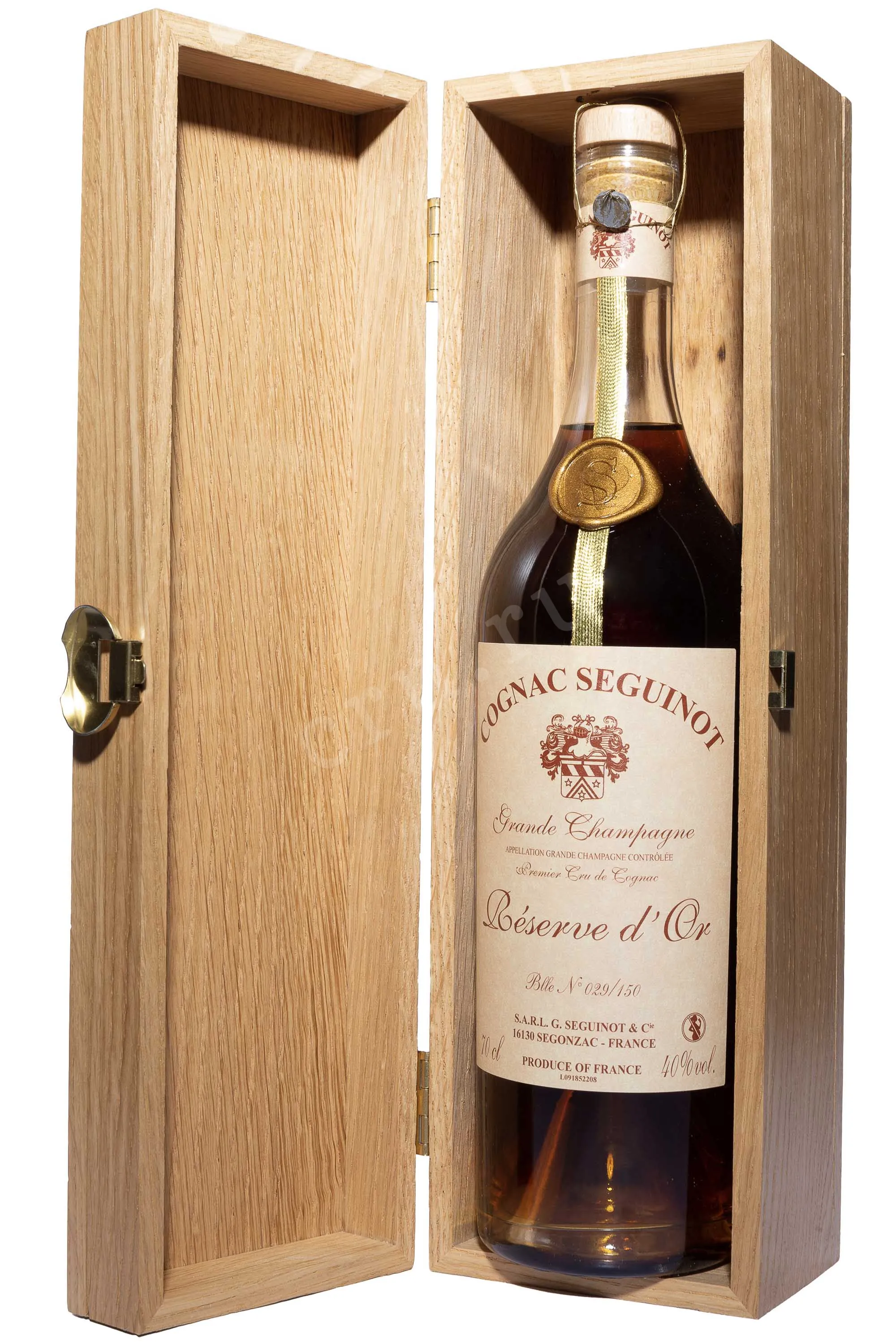 Коньяк Seguinot Reserve d'Or Grande Champagne 0.7 л — винтажный французский cognac премиум-класса, который был создан лучшими мастерами купажа именитого коньячного дома Сегино из высококачественного винограда урожая 1914 года, собранного в субрегионе Гран Шампань. Отборные коньячные дистилляты высочайшего качества очень долго выдерживались в особых дубовых бочонках на протяжении 60-80 лет, в погребах производителя. Был произведен в ограниченном количестве — всего 300 бутылок, с персональным номером на этикетках. В 1952 году являлся главным коньяком на коронации Елизаветы II. Поступает в деревянной упаковке, станет незабываемым подарком для коллекционера и ценителя редкого французского алкоголя.