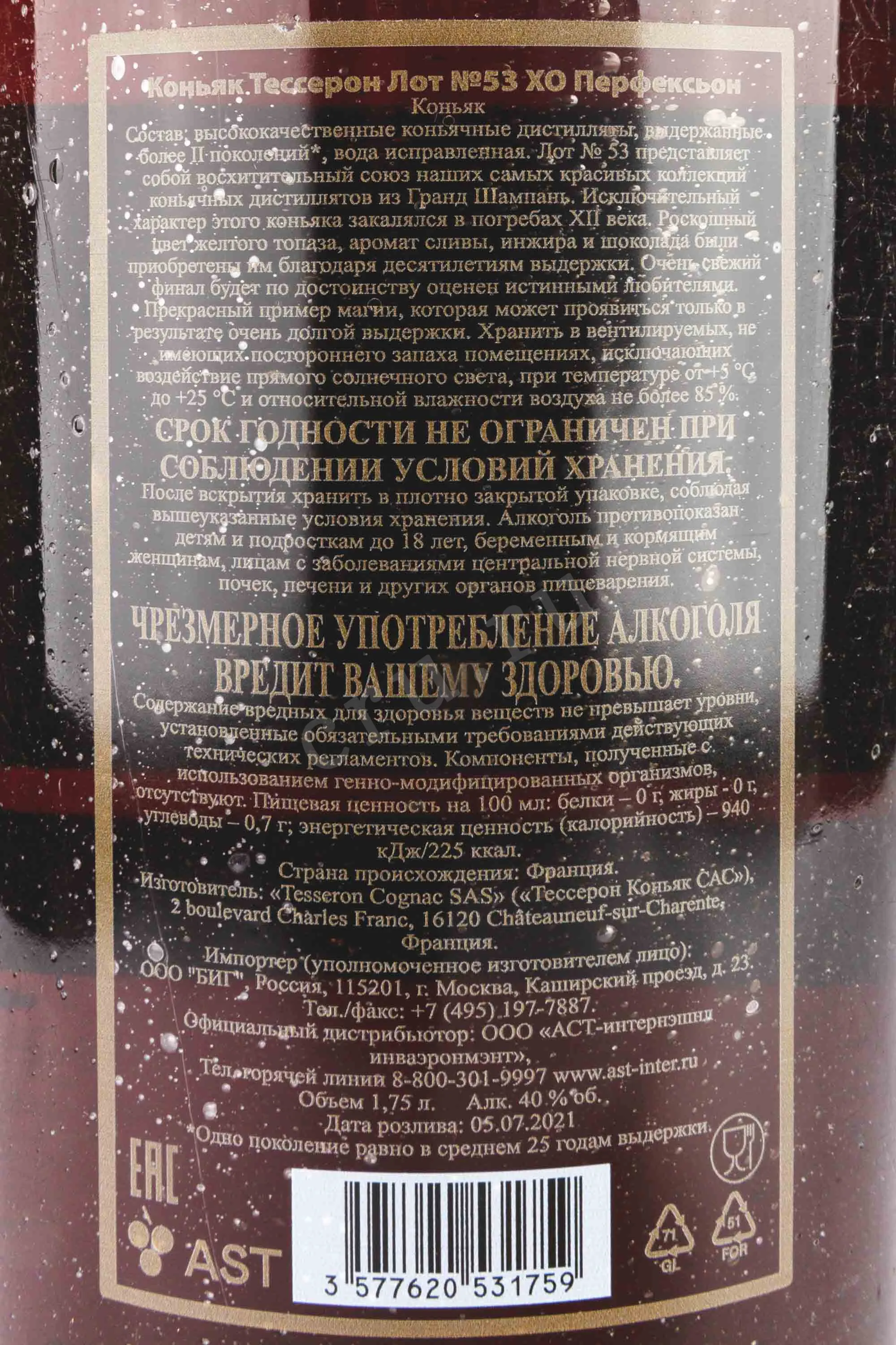 Коньяк Tesseron Lot №53 XO Perfection gift box 1.75 l – это зрелый cognac от французского производителя, представленный в сосуде объемом 1.75 л в сопровождении с подарочной упаковкой. Основой 40-процентного напитка являются спирты 1950-1952 годов с региона Grande Champagne. Выдержка алкоголя протекала в старых барриках из дуба Лимузен не менее 50 лет. Коньяк получил 98 баллов от известного винного критика Роберта Паркера, а также 5 звезд от авторитетного издания Spirit Journal. Это статусный презент на юбилей, годовщину свадьбы и т.д.