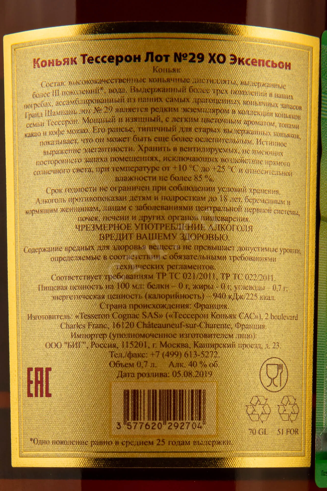 Коньяк Tesseron XO Exception Lot 29 0.7 л – суперпремиальный французский cognac, который производится лучшими мастерами коньячного дома Тессерон из местных сортов винограда, растущих в субрегионе Гран Шампань. Ассамбляж собран из самых редких коньячных спиртов, год рождения самого старинного – 1906. Выдержка в течение длительного времени проходит в специальных бочонках из лимузенского дуба на протяжении 75 лет. Обладает неповторимой гаммой вкусоароматических показателей. Продается в яркой сувенирной упаковке, станет отличным подарком для коллекционера и ценителя выдержанного французского алкоголя. Данный релиз получил 100 баллов от эксперта Роберта Паркера. Lot 29 является редкой жемчужиной в именитой коллекции Tesseron.