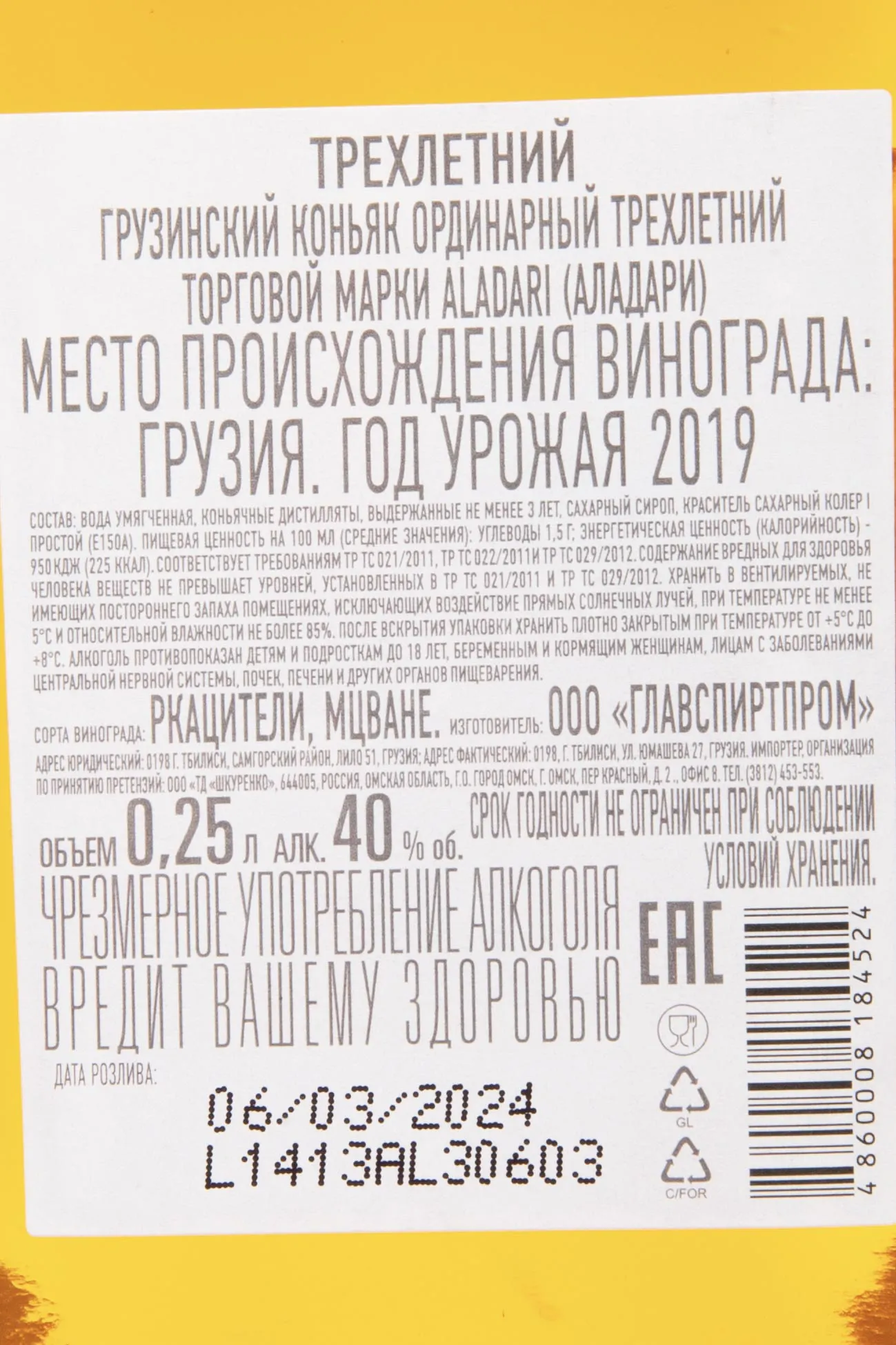 Коньяк Aladari трёхлетний 0,25 л — это элегантный напиток с ярким характером и тонким грузинским акцентом. Изготовлен по классической технологии из отборных виноградных сортов, выращенных на солнечных склонах, и выдержан в дубовых бочках не менее трёх лет. Он отличается гармоничным вкусом и благородным ароматом, идеально подходящим как для дружеских встреч, так и в качестве дополнения к изысканным блюдам. Производитель — ООО «Главспиртпром».