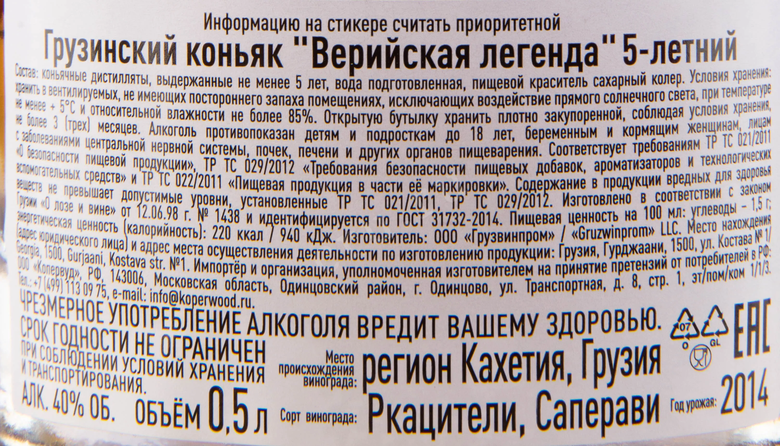 Коньяк Верийская Легенда 5-летний 0.5 л – классический грузинский cognac, производится из местных сортов белого винограда, растущих в регионе Кахетии. Коньячные дистилляты высокого качества выдерживаются в дубовых бочках на протяжении 5 лет.