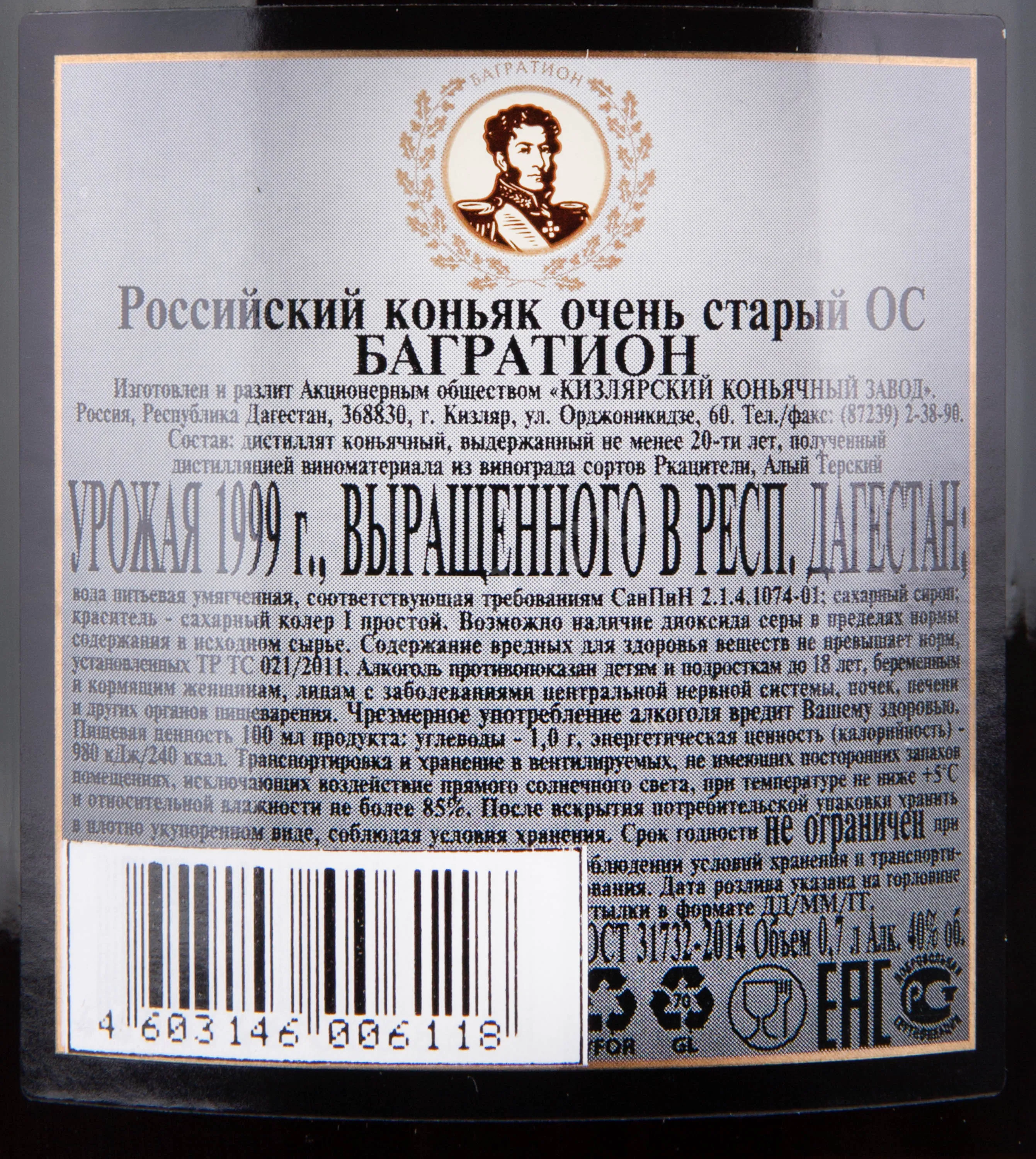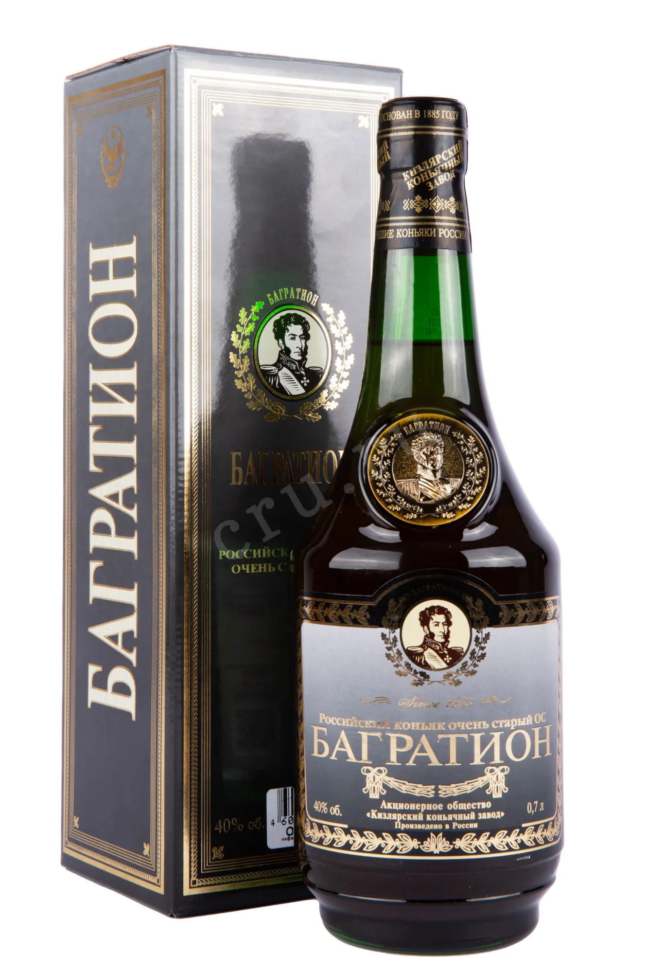 Коньяк Багратион ОС 20-летний 0.75 л производится мастерами Кизлярского коньячного завода с 1994 года. Для изготовления используются лишь отборнейшие сорта местного винограда и коньячные дистилляты высочайшего качества с выдержкой бочках из столетнего дуба не менее 20 лет. Премиальный коньяк получил свое название в честь именитого полководца – Петра Багратиона. Он упакован в изысканную сувенирную коробку, станет прекрасным подарком на фарфоровую свадьбу и на любое другое торжество.