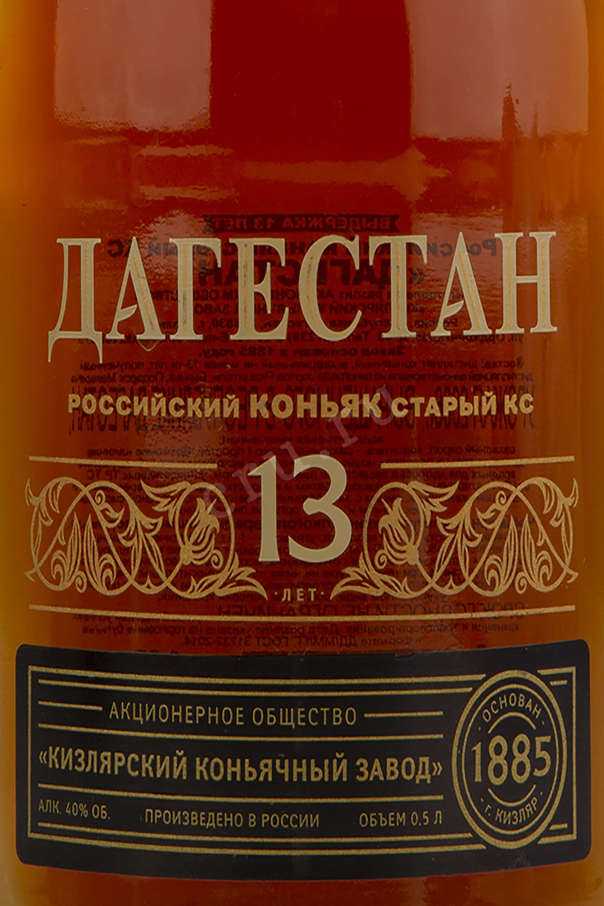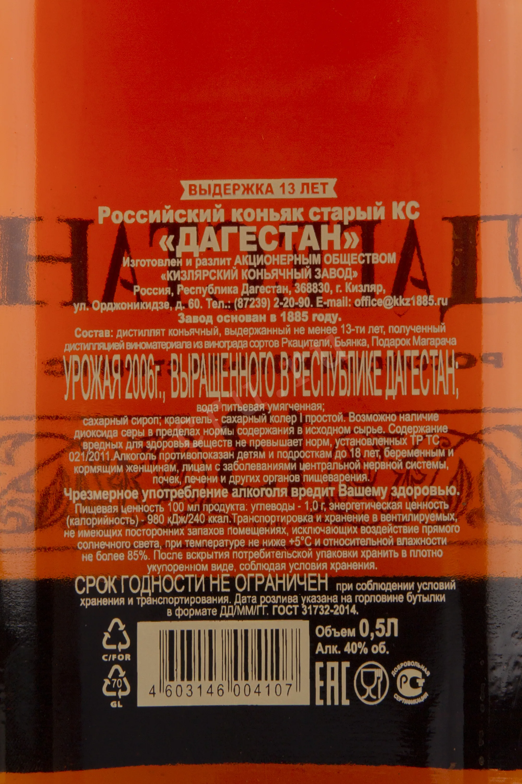 Коньяк Кизлярский КС Дагестан 13 0.5 л - роскошный, богатый напиток, который был выпущен в 1967 году в честь юбилея Дагестана. Относящийся к классу КС, производится из коньячных спиртов, выдержанных не менее 13 лет.