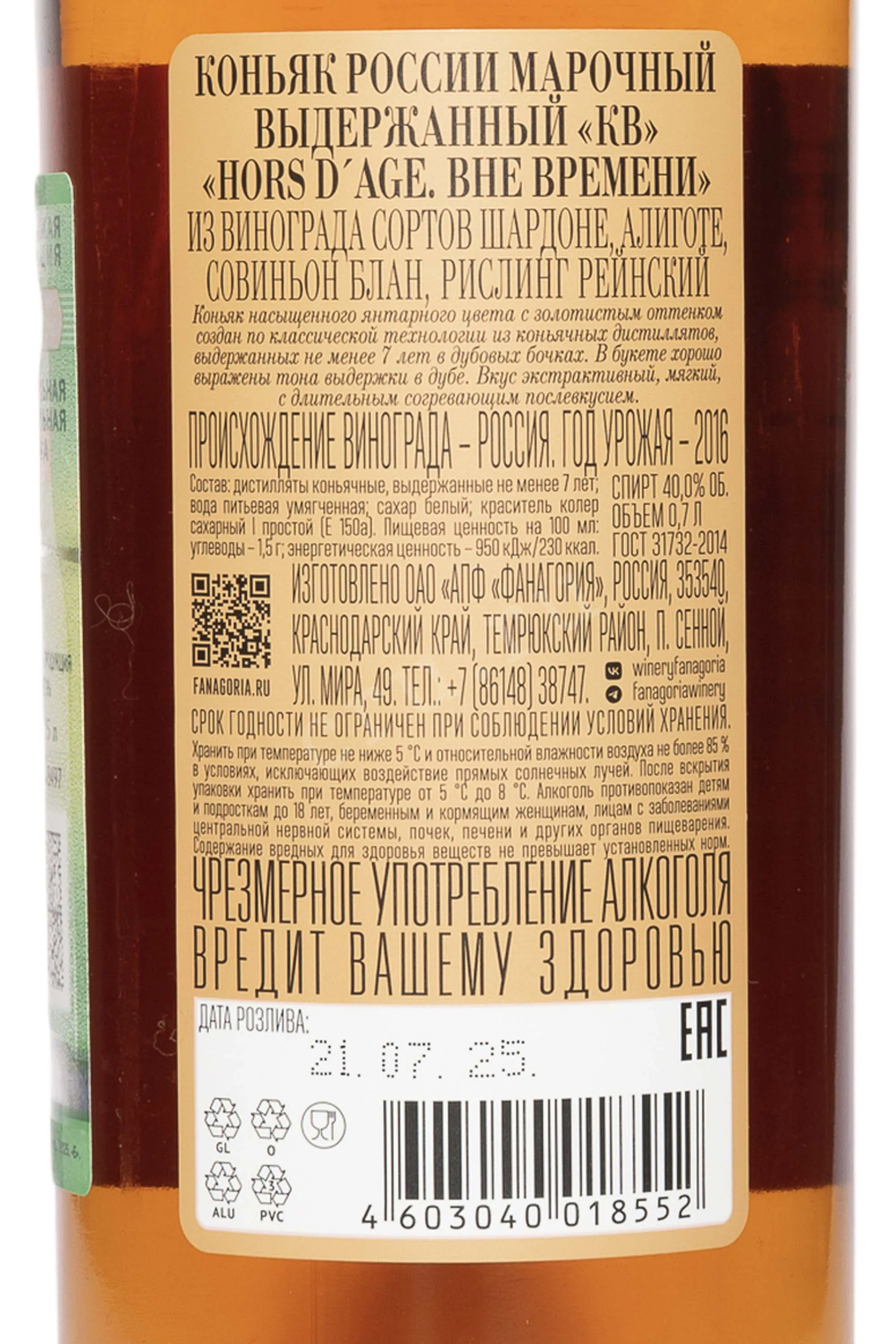 Коньяк Фанагория Вне Времени 7-летний 0,7 л — российский алкоголь премиум-класса, созданный из отборных выдержанных дистиллятов. Сырье для его производства выращивается на собственных виноградниках компании Fanagoria в Тамани. Купаж включает спирты, созревавшие не менее семи лет в дубовых бочках из лимузенского и кавказского дуба. Напиток отражает фирменный стиль дома Фанагория — гармонию традиций французской школы коньячного дела и южно-российского терруара. Медленная выдержка при контролируемой температуре придает ему сложность и благородную мягкость. 7-летний вариант отмечен на отечественных дегустационных конкурсах и положительно оценивается экспертами за чистоту вкуса и сбалансированный характер.