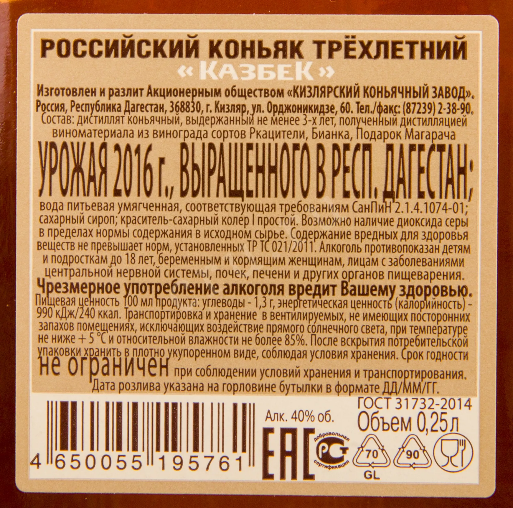 Коньяк Казбек Трёхлетний 0,25 л — популярный на отечественном рынке крепкий напиток со спиртуозностью 40%, который выпускается в небольших бутылках с удобными крышками. Его поставляет предприятие из дагестанского города Кизляра, осуществляющее все производственные стадии: от сбора винограда с собственных угодий до бутилирования. Алкоголь отличается непродолжительной выдержкой — порядка трех лет.