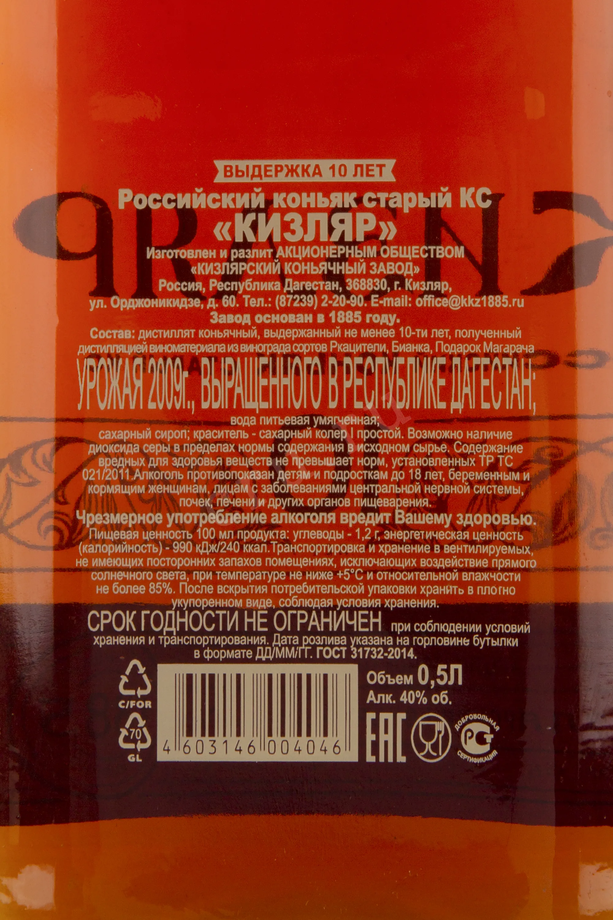 Коньяк Кизлярский КС Кизляр 10 лет 40% 0.5 л изготавливается с 1959 года и является одним из самых старых напитков завода. Производится из коньячных спиртов, выдержанных не менее 10 лет.