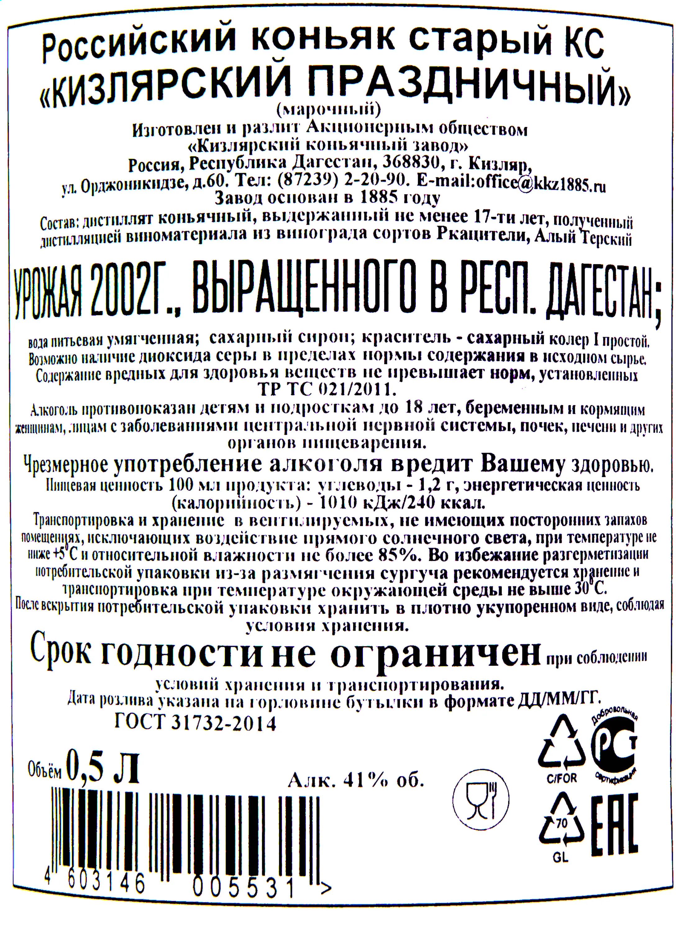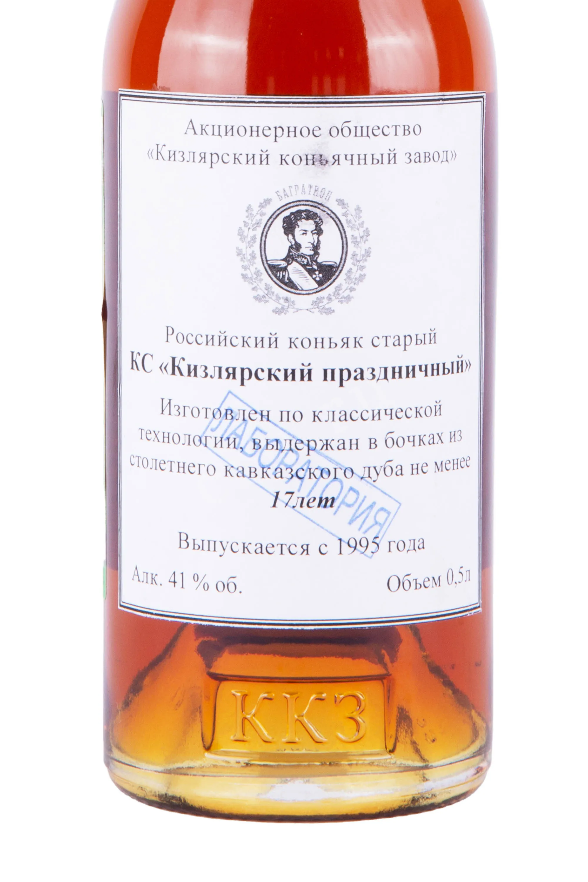 Коньяк Кизлярский Праздничный КС 17 лет с сургучной печатью — выдержанный крепкий напиток (в нем содержится 41% алкоголя) в красивой бутылке, выпуск которого был приурочен к 110-й годовщине со дня основания завода-изготовителя. Коньяк на базе виноградного сырья с угодий Дагестана произвели в городе Кизляре путем традиционной перегонки ферментированного сусла и вызревания в дубе сроком 17 и более лет.