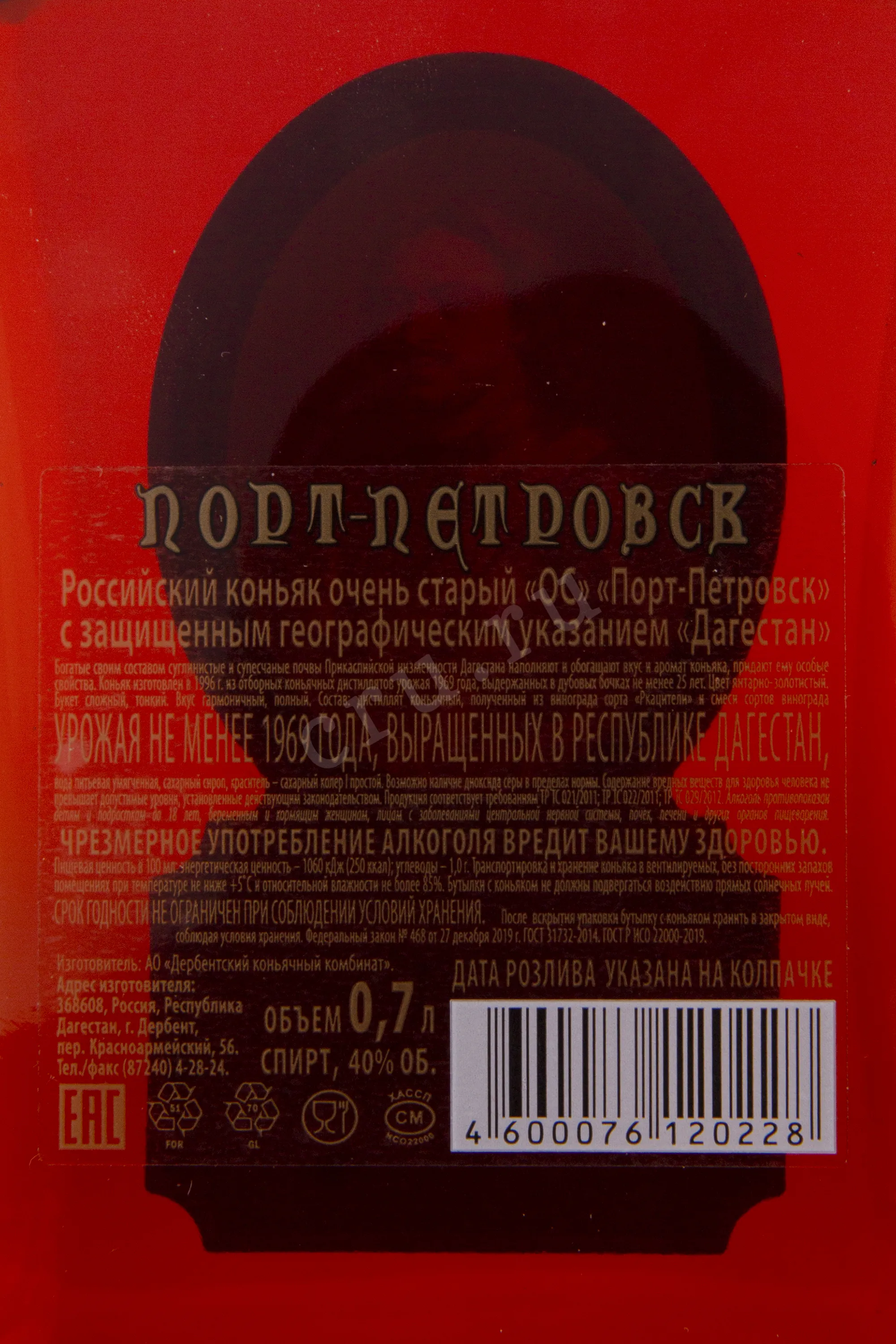 Коньяк Порт-Петровск ОС 25 лет 40% 0.7 л – коллекционный напиток, который носит историческое название столицы Дагестана – города Махачкала, с 1857 по 1921 назывался – Петровск. Производится из коньячных спиртов бочковой выдержки среднего возраста не менее 25 лет.