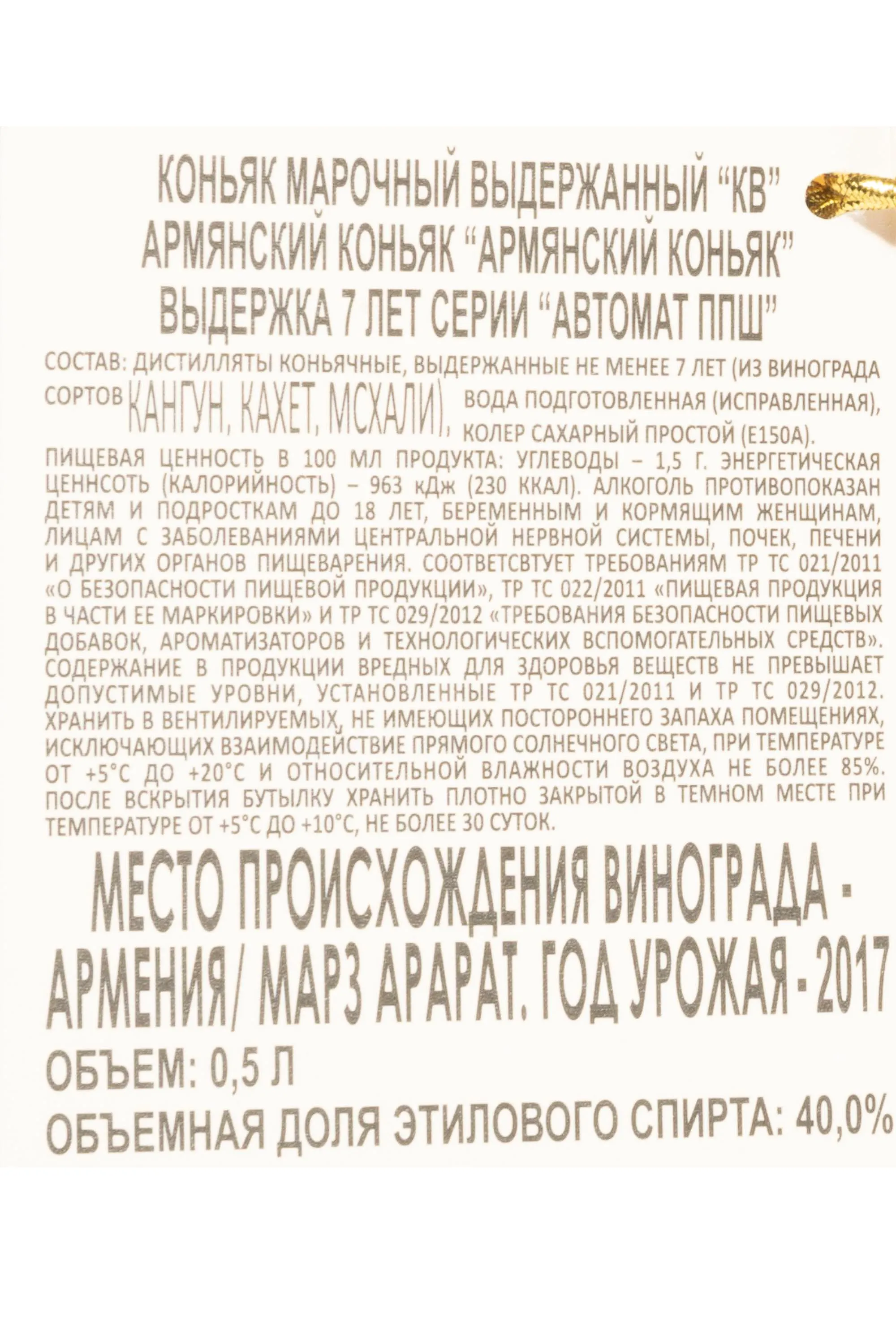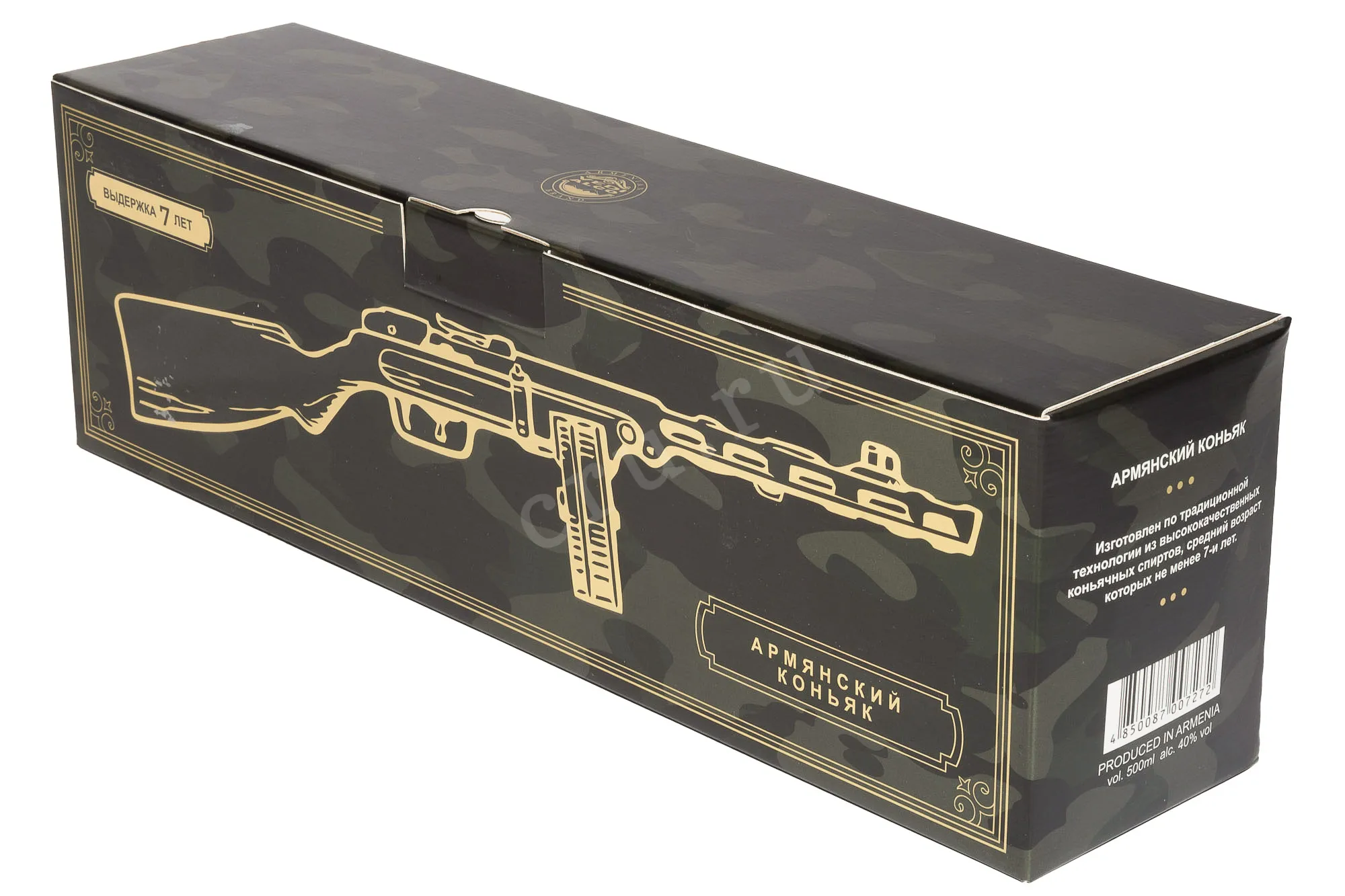 Коньяк Vedi Alco KV 7 Years PPSH Gun in gift box 2017 0.5 л отличается оригинальной формой подачи — он был разлит в бутылку, стилизованную под легендарный автомат ППШ, и помещён в подарочную коробку. Напиток создавался по классической армянской технологии, основанной на двойной перегонке виноградного сырья и последующей выдержке в дубовых бочках не менее семи лет. Виноград собирали в предгорьях Араратской долины, где тёплый климат и богатые вулканические почвы обеспечивали ягодам концентрированный вкус и гармоничное содержание сахаров. Медленная выдержка в бочках позволяла дистилляту обрести мягкость и сложность, вобрав в себя древесные тона, оттенки сухофруктов и лёгкие пряные нюансы.