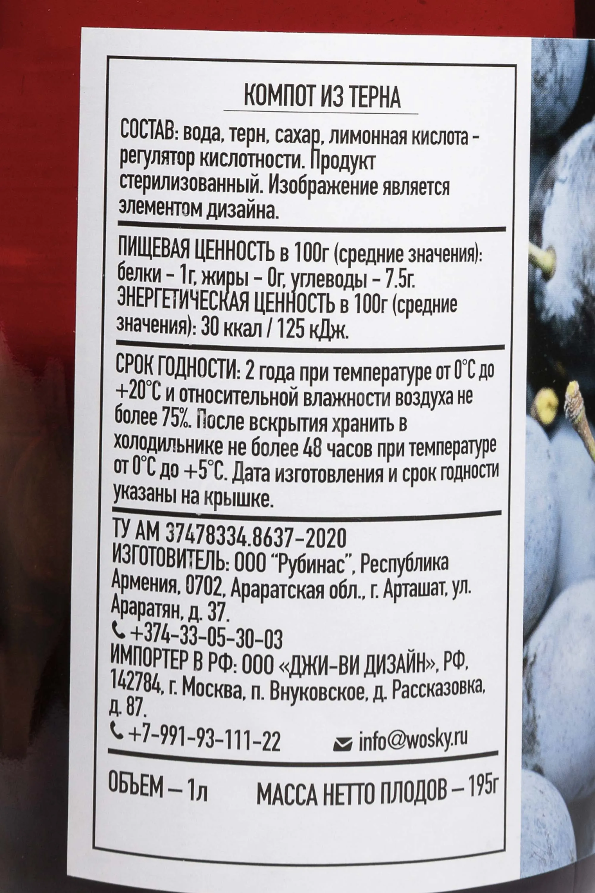 Компот Wosky Blackthorn 1 л обладает необычным вкусом с легкими терпко-вяжущими нотками. Производится в Армении из плодов тёрна с добавлением воды и сахара, без сложных компонентов и искусственных добавок. Основой служит натуральное сырьё, что обеспечивает чистый и узнаваемый вкус. Напиток создаётся по принципам домашней рецептуры, с сохранением природных свойств плодов. Компот богат природными веществами, характерными для тёрна. Он хорошо освежает и утоляет жажду. Продукт проходит стерилизацию, что гарантирует стабильное качество и безопасность. Компот разлит в стеклянную бутылку объёмом 1 литр, удобную для хранения и сервировки.