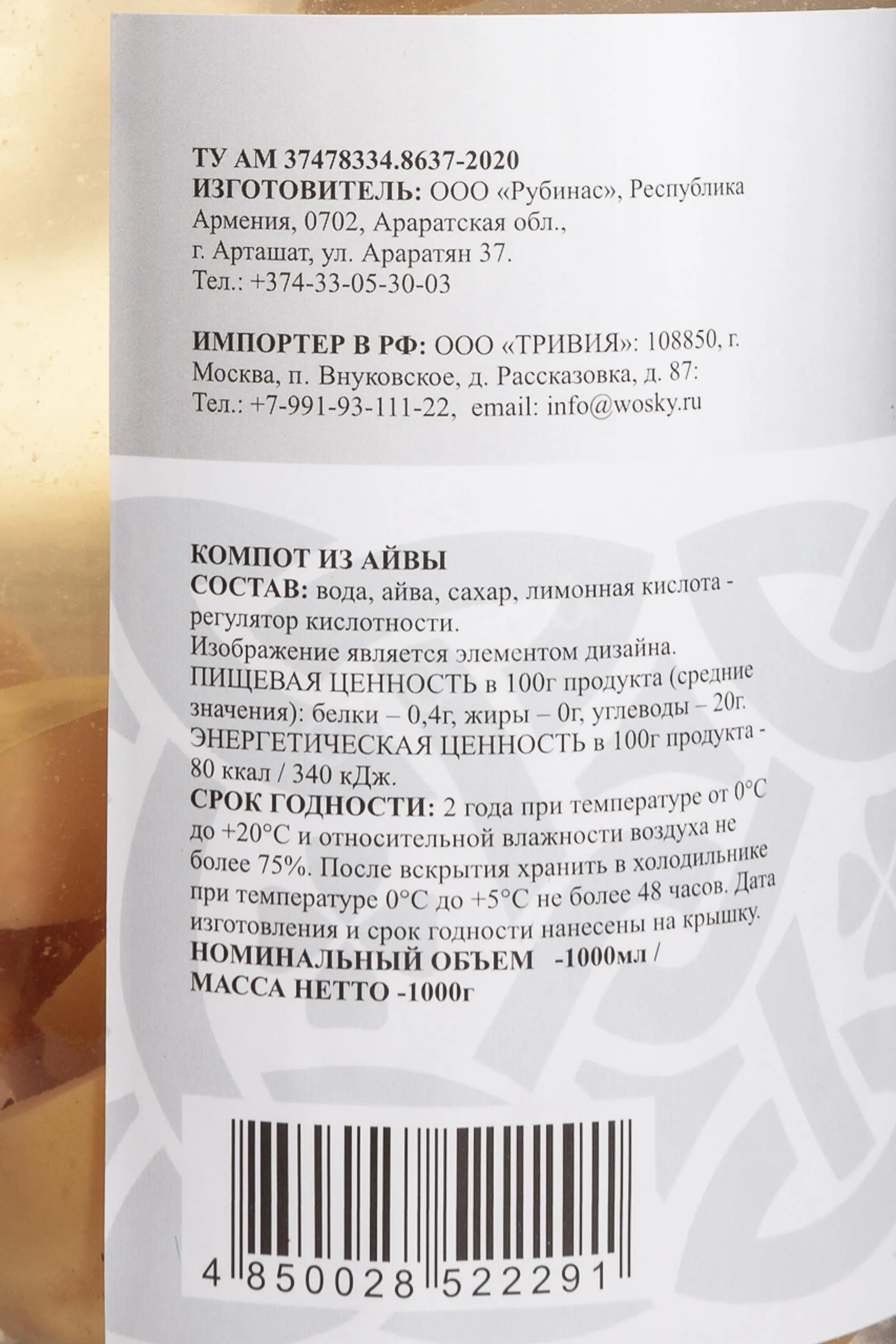 Компот Wosky Quince 1 л — традиционный фруктовый напиток из Армении, созданный на основе айвы. В производстве используется минимум ингредиентов: вода, спелые плоды и сахар. Напиток готовят по домашнему принципу с бережной тепловой обработкой, что позволяет сохранить природные свойства фрукта. Компот стерилизуется и разливается в стеклянные бутылки, удобные для хранения и подачи. Айва богата природными кислотами и пектинами, поэтому напиток хорошо освежает и утоляет жажду. Вкус узнаваемый и сбалансированный, без резкой сладости.
