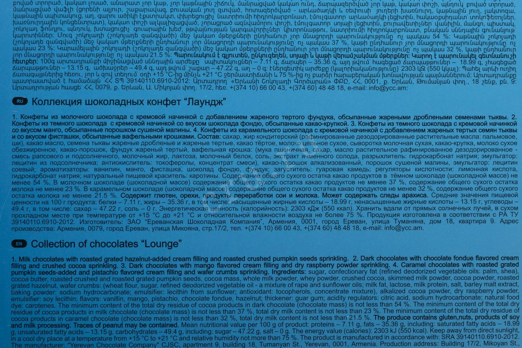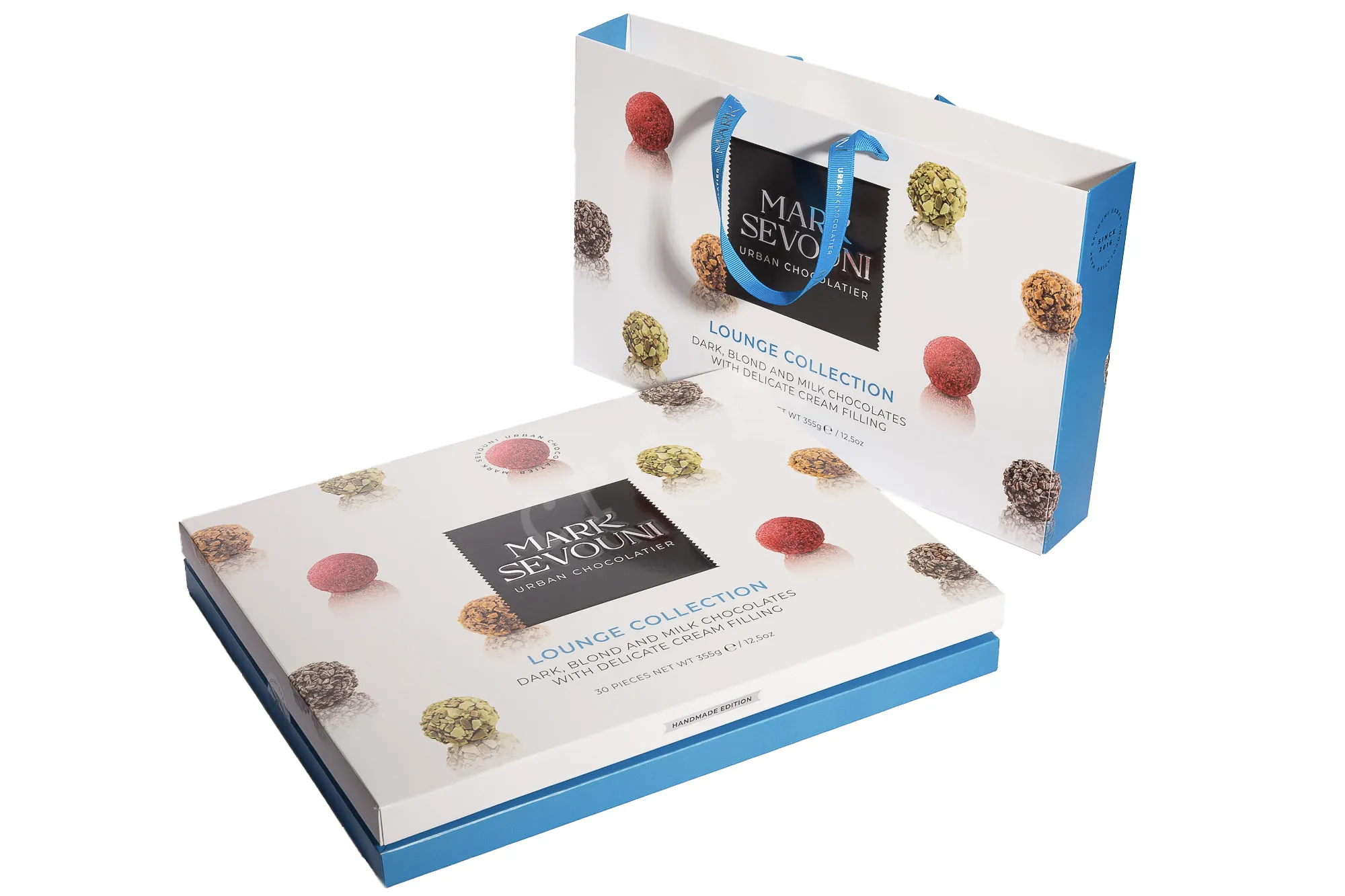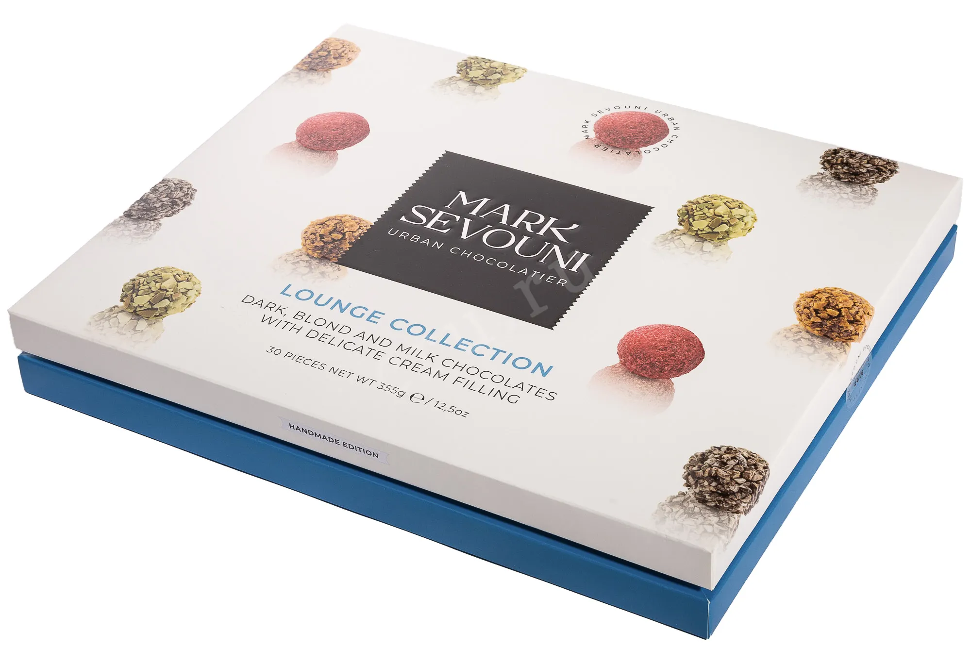 Конфеты Mark Sevouni Lounge Dark, Blond and Milk chocolates with delicate cream filling 355 г представляют собой набор изделий, объединённых единым мягким стилем. В основе — тёмный, молочный и белый шоколад с натуральным какао. Шарики с нежной сливочной начинкой имеют хрустящее покрытие, раскрываясь в каждом кусочке приятным контрастом. В составе сета — четыре разновидности: