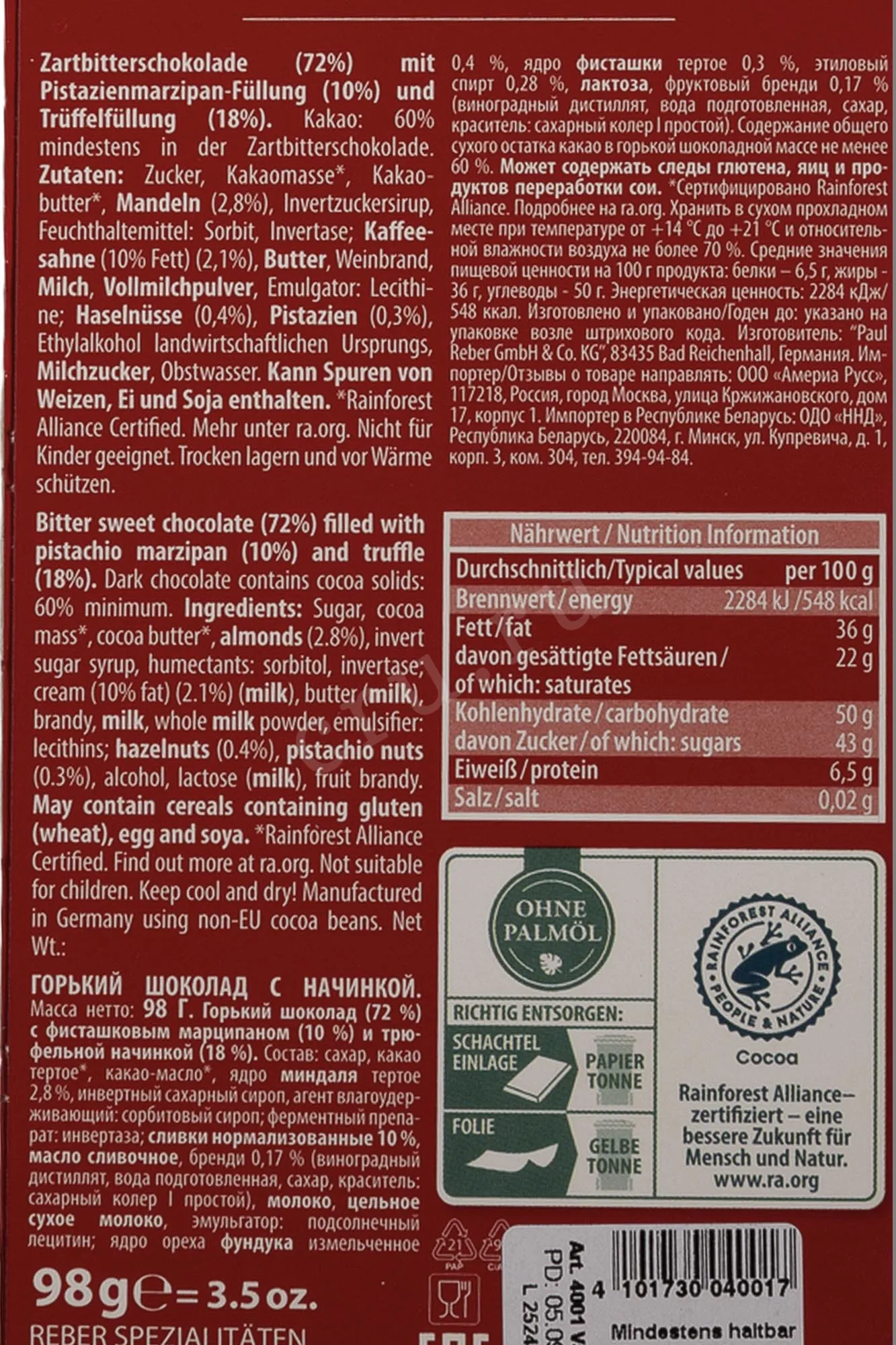 Шоколад Paul Reber Mozart Dark Chocolate Pistachio Marzipan and Truffle 98 г — это изысканный десерт в удобной форме плитки, созданный по традиционным рецептам знаменитого бренда Ребер. Корпус выполнен из благородного темного шоколада (содержание какао не менее 60%) с насыщенным ароматом какао. Внутри скрыта многослойная начинка из фисташкового марципана и нежного трюфельного крема. Упаковка оформлена в фирменном стиле с изображением Моцарта, что делает шоколад отличным подарком для ценителей классики.