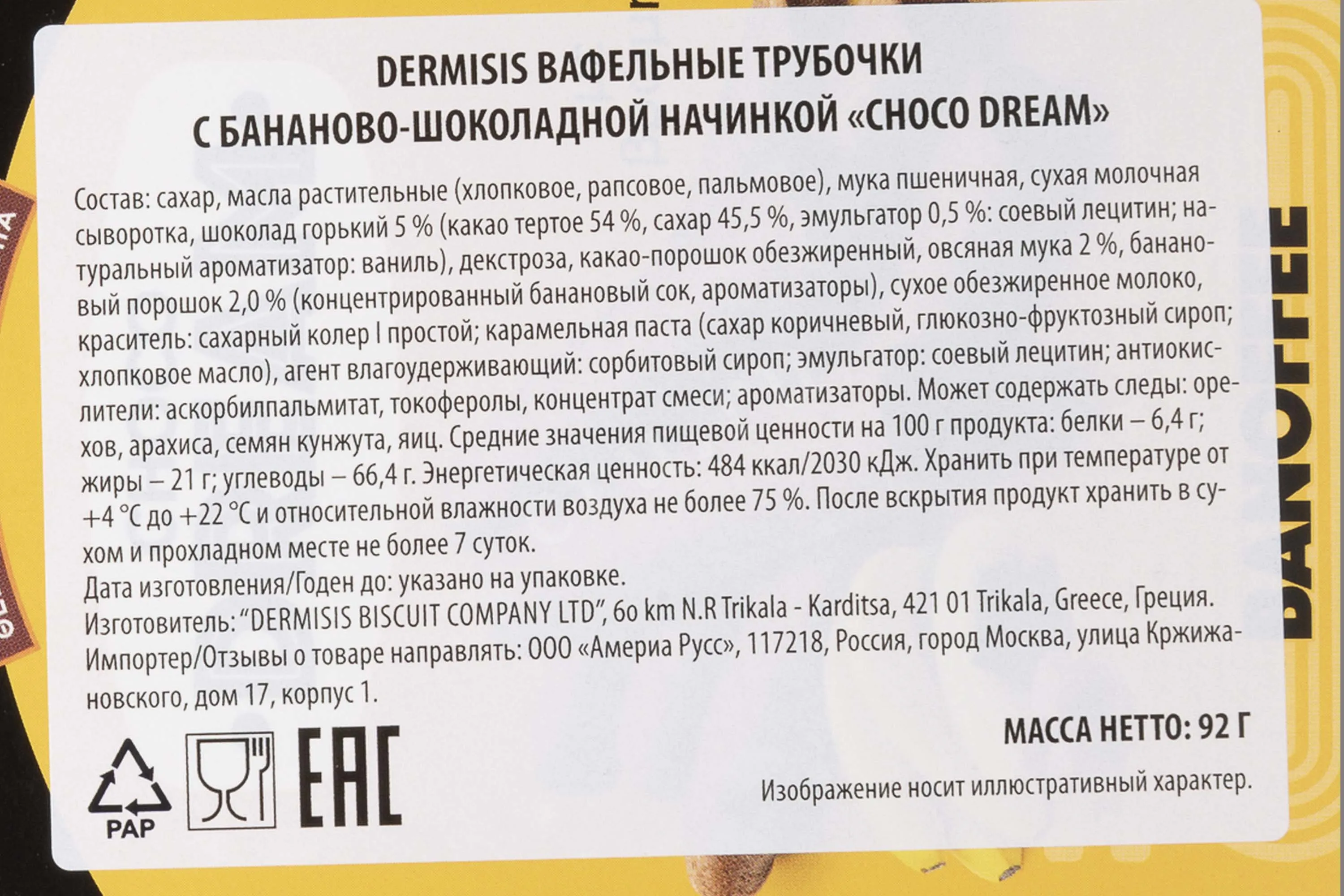 Вафли Dermisis Choco Dream Banoffee with oat flour — это хрустящий десерт в форме трубочек с нежной кремовой начинкой. Легкие вафельные слои сочетаются с насыщенным бананово-карамельным кремом и покрыты тонким слоем шоколада. Продукт создан для любителей сладостей, которые ценят гармонию вкуса и натуральные ингредиенты. Упаковка удобно подходит для перекуса дома, в дороге или на работе.