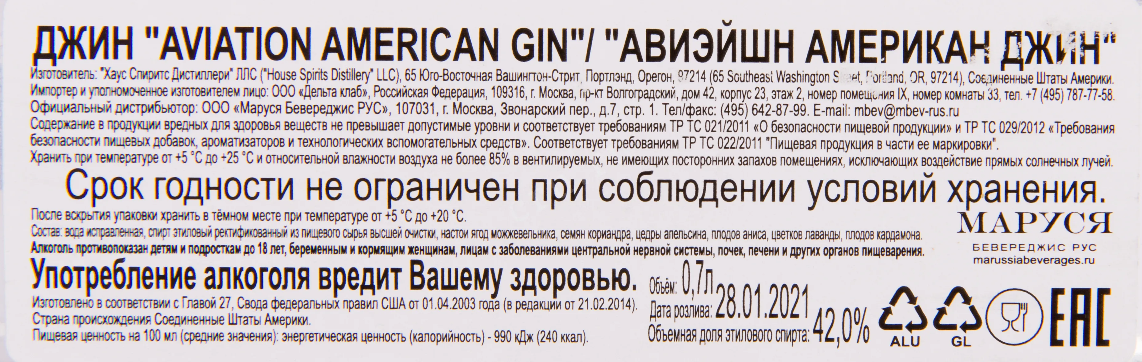 Джин Aviation American 0,7 л — американский джин в стиле New Western Dry, ставший заметной частью современного движения крафтовой дистилляции в США. Производитель подчёркивает, что напиток создавался как гармоничная основа для коктейлей, прежде всего для классического Aviation, с более мягким акцентом на можжевельник по сравнению с традиционными стилями. В основе используется нейтральный зерновой спирт, преимущественно из ржи. Рецептура включает смесь ботаникалов, собранных в разных регионах мира, среди которых заявлены можжевельник, лаванда, кардамон, анис, кора растений сассафрас из семейства лавровых, а также цитрусовая кожура. Ароматизация проводится до дистилляции, без последующего подслащивания. Крепость составляет 42%. Напиток выпускается в бутылке, вдохновлённой эстетикой ар-деко и эпохой джаза, что подчёркивает связь бренда с культурой начала XX века.