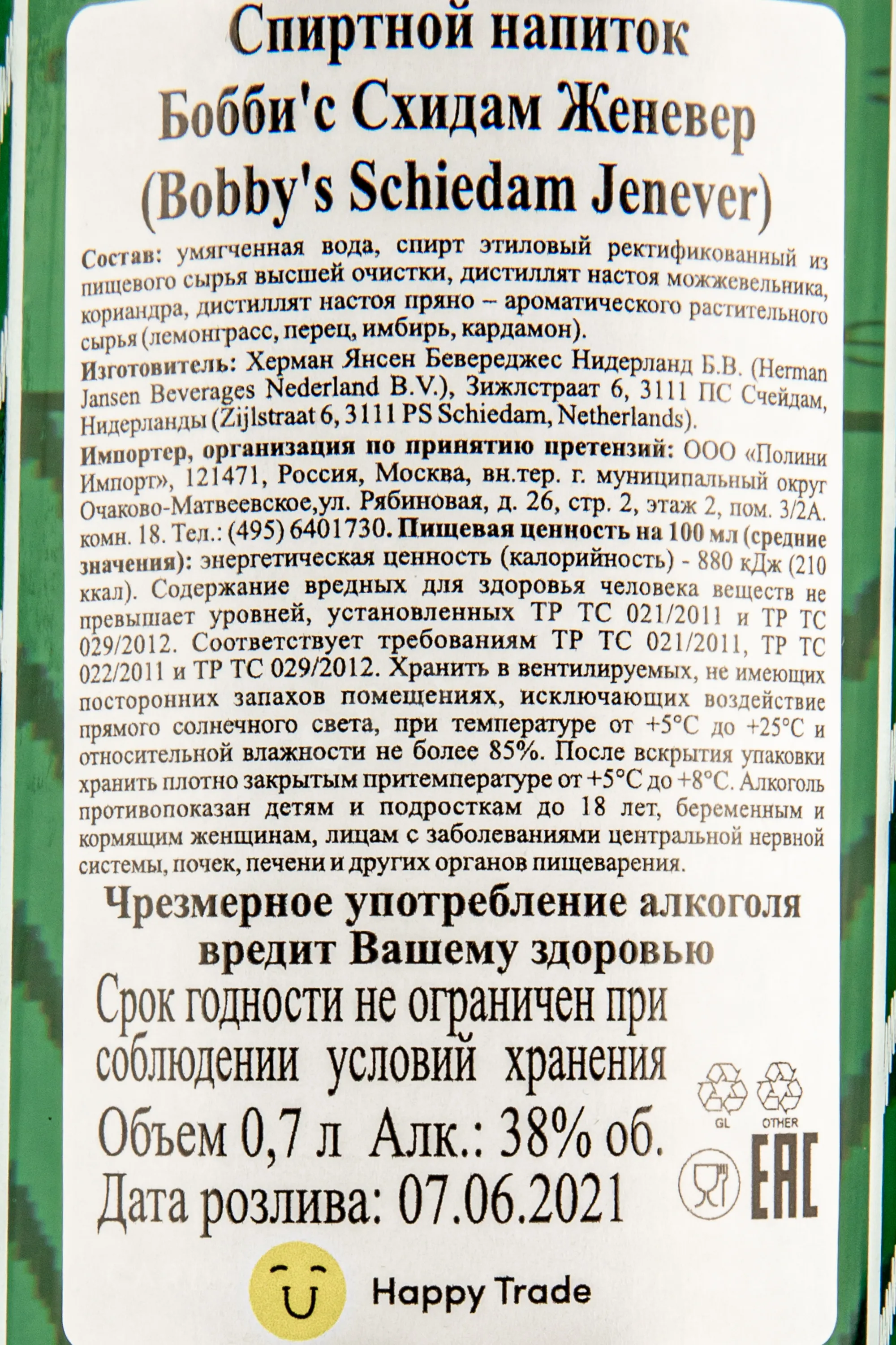 Джин Bobby's Schiedam Jenever 0,7 л — представитель исторического нидерландского стиля. Напиток изготавливают в городе Схидам, который считается центром этого направления. Рецепт опирается на семейное наследие Якоба «Бобби» Альфонса. В отличие от классического состава, здесь основой служит солодовый спирт. Он придаёт купажу тонкие ореховые нюансы. Также в рецептуре используют можжевельник, кориандр и ботаникалы, характерные для марки, — кардамон, перец, имбирь, лемонграсс. Перегонка проходит в медных кубах, крепость при розливе составляет 38%.