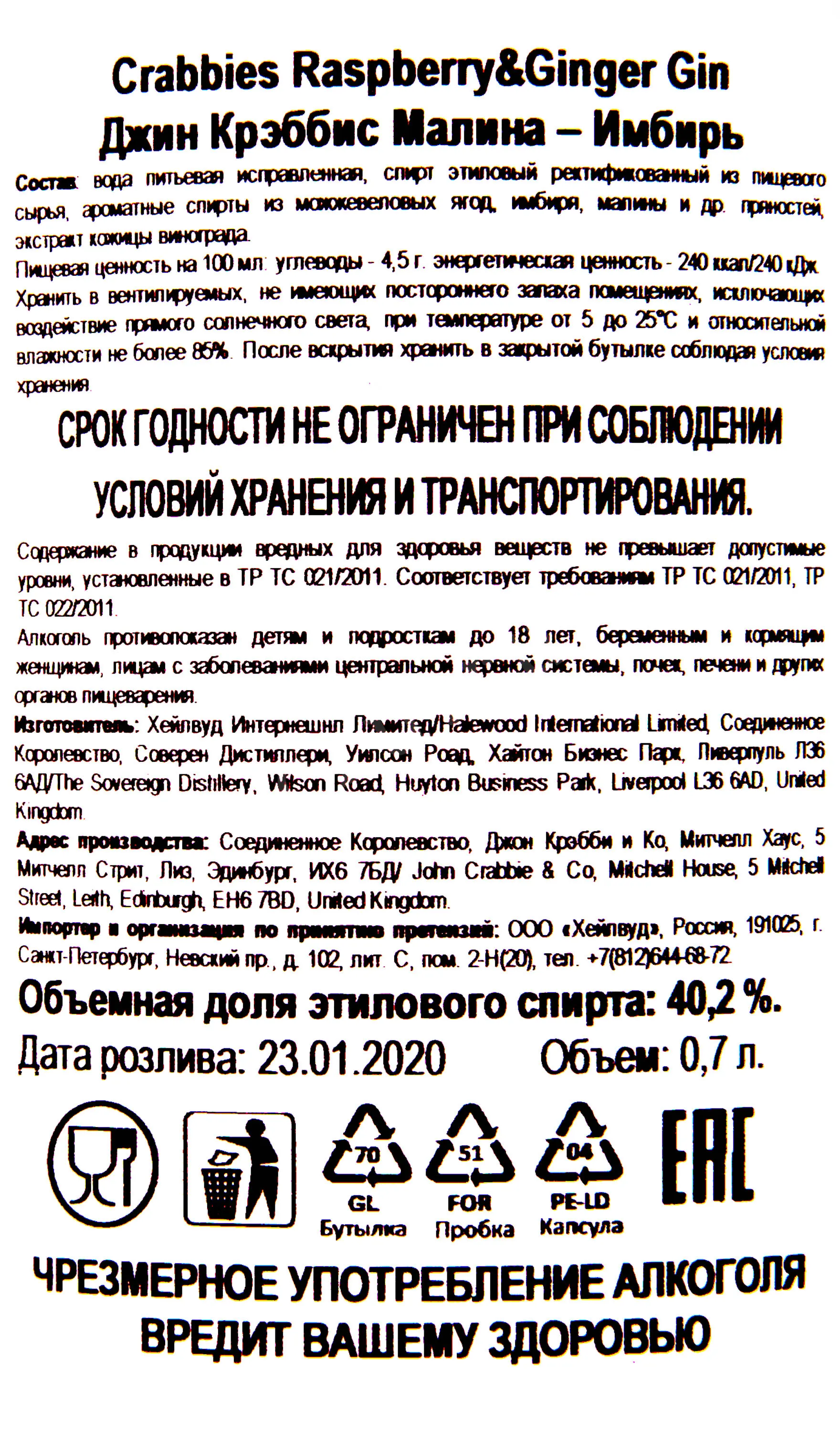 Джин Crabbie's Raspberry-Ginger 0,7 л — ароматизированный релиз, созданный шотландской компанией. В основе используется классический зерновой дистиллят, с последующей ароматизацией натуральными растительными компонентами. К традиционному набору ботаникалов добавляют малину и имбирь, что формирует характерный профиль напитка. Спиртное выпускается с крепостью 40,2%, что соответствует классическому стилю и обеспечивает баланс между выразительным ароматом и чистотой вкуса.