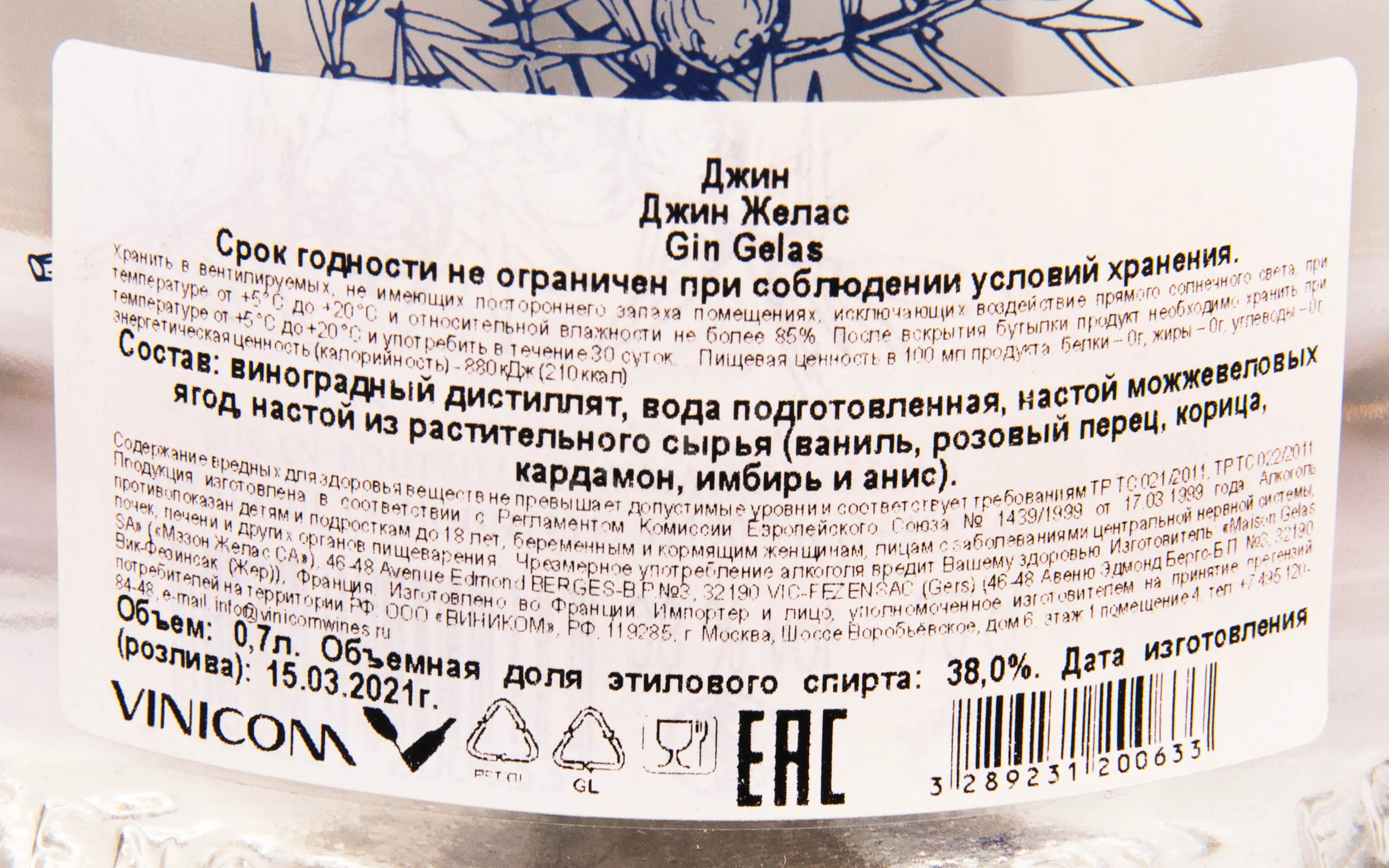 Джин Gelas 0.7 л был создан известным французским домом Gelas, история которого началась в 1865 году в Гаскони. В процессе изготовления спирты настаивались на тщательно подобранных ингредиентах растительного происхождения, включая можжевеловые ягоды, кардамон, розовый перец, имбирь, ваниль. Для получения мягкости и насыщенного вкуса напиток перегонялся медленно, малыми партиями, в традиционных медных кубах. После дистилляции проводилась бережная фильтрация, благодаря которой конечный продукт обрел высокую чистоту и прозрачность.