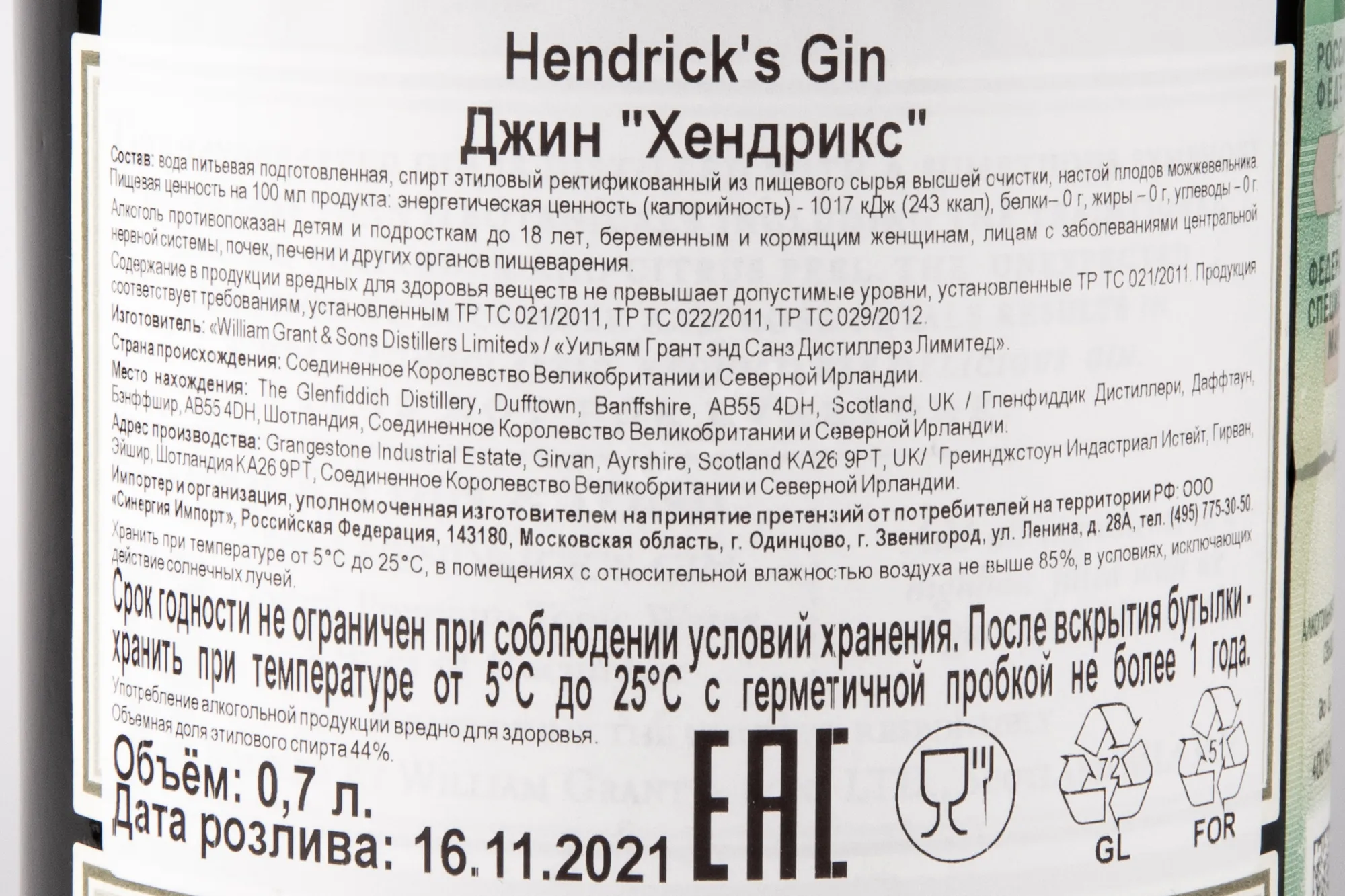 Джин Gin Hendrick's 0.7 л выпускается небольшими партиями, что указывает на его особенный характер. Производство расположено в Шотландии. Используется чистая вода из источника Penwhapple. Спирты получают раздельно в двух медных перегонных кубах — Беннет и Картер, затем мастер купажа соединяет их для достижения мягкости и баланса. В рецептуре более десяти растительных компонентов. Среди них специи из разных стран, а также настои свежего огурца и лепестков болгарской розы. Эти добавки формируют свежий и цветочный профиль. Напиток отличается гармонией и чистотой вкуса. С момента выхода на рынок джин получил ряд международных наград, включая золотые медали на конкурсе San Francisco International Spirits Competition, а также был отмечен званиями «Джин года» и «Лучший в мире джин» по версии профильных изданий.
