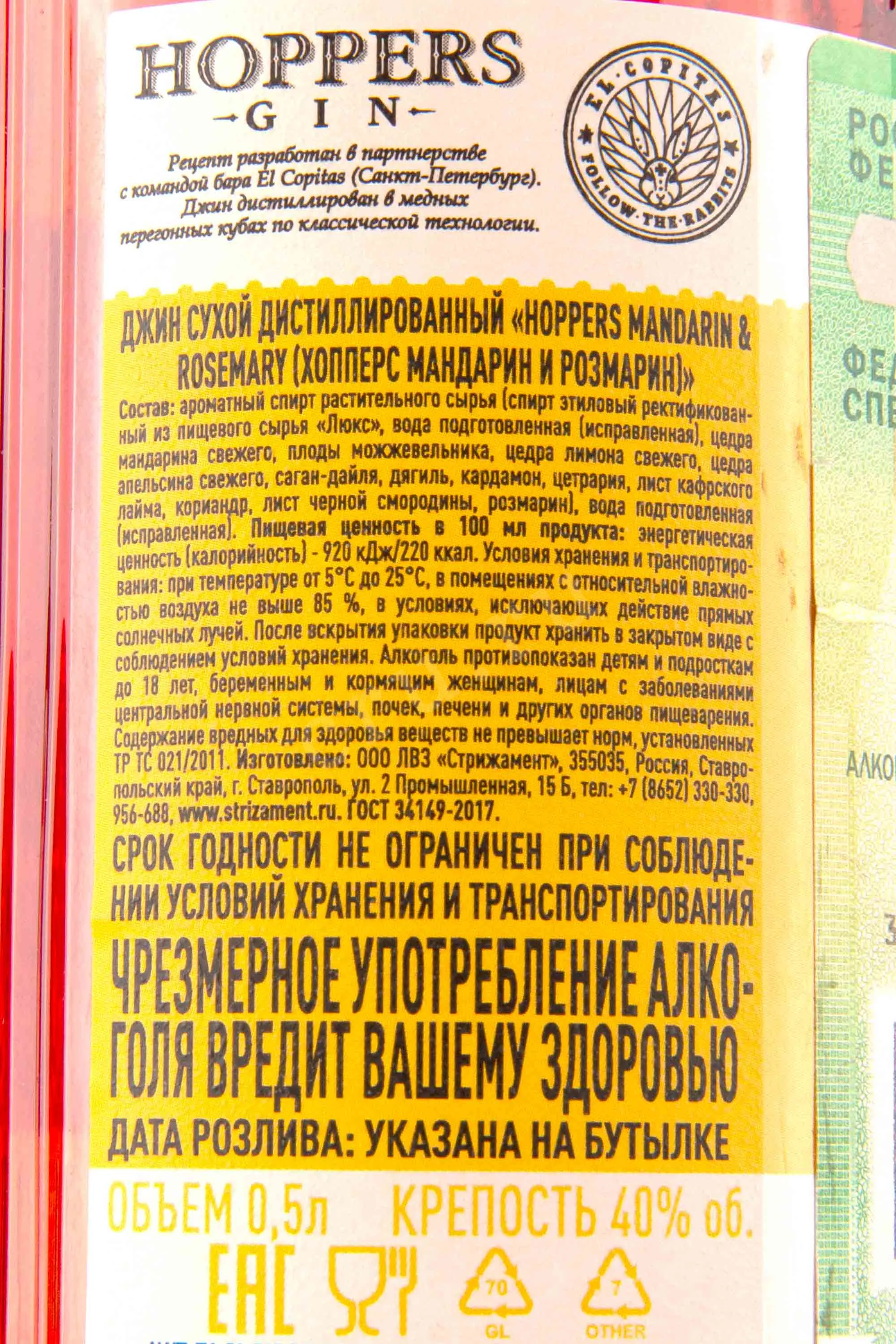 Hoppers Mandarin & Rosemary 0.5 л купить - Джин Хопперс Мандарин и Розмарин цена в магазине КРЮ ПРОФИ