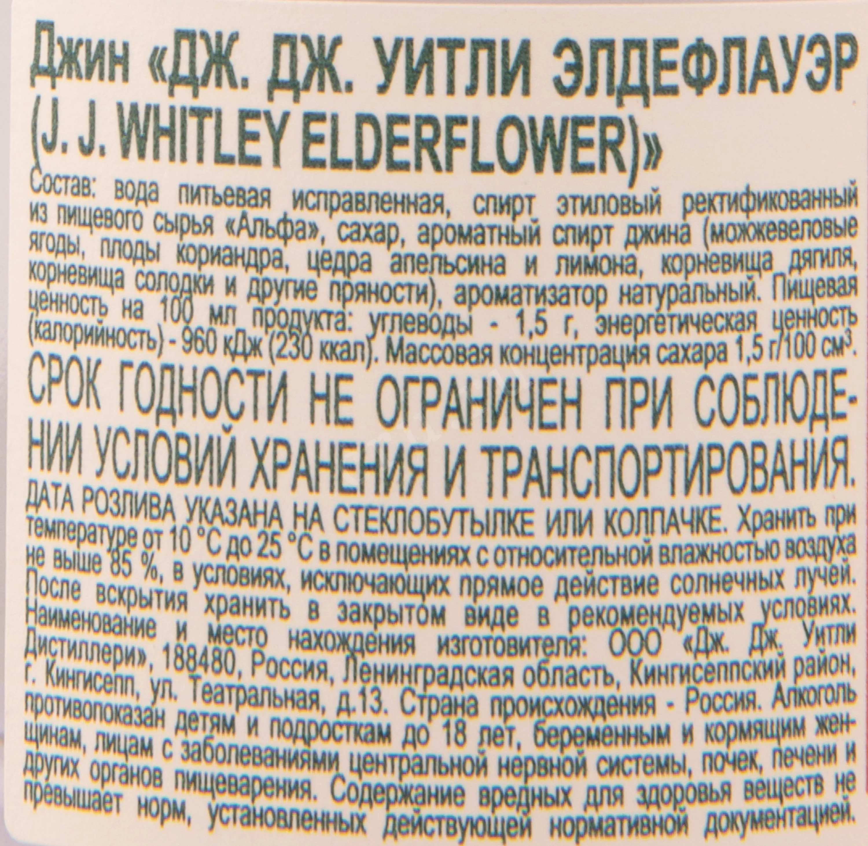 Джин J.J. Whitley Elderflower 0,5 л — ароматизированный дистиллят российского производства. Основой служит зерновой спирт, который перегоняют с традиционными растительными компонентами, включая можжевельник и ряд пряных трав. После перегонки основу ароматизируют натуральными экстрактами цветов бузины. Такой приём придаёт напитку мягкий цветочно-фруктовый характер и заметно отличает его от классических вариантов. Производитель позиционирует эту версию как лёгкую и ароматную интерпретацию английского стиля, подходящую для коктейлей и простых смешанных напитков. Цветочные компоненты добавляют после дистилляции, что позволяет сохранить чистоту основы и подчеркнуть свежесть растительного сырья. Продукт входит в коллекцию ароматизированных вариантов бренда, вдохновлённых природными ингредиентами и современными барными традициями.