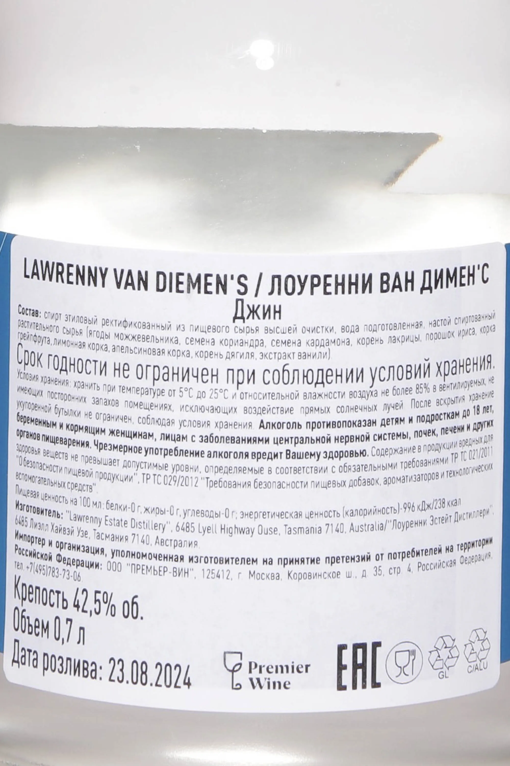 Джин Lawrenny Van Diemen's 0.7 л — современный австралийский джин из Тасмании. Он создаётся на базе чистого спирта, настоянного на сочетании классических и необычных ботанических ингредиентов. Среди них — клубника и миндаль из садов имения, цветы липы, цитрусовые, фенхель и ваниль. Вода из реки Деруэнт придаёт напитку мягкость и чистый вкус. Джин отмечен международными наградами: он получил золото на престижных конкурсах и стал призёром в Австралии и Европе. Критики выделяют яркий аромат ягод и цитрусов с тонкой игрой травяных оттенков, подчеркивая его свежий и многогранный характер.