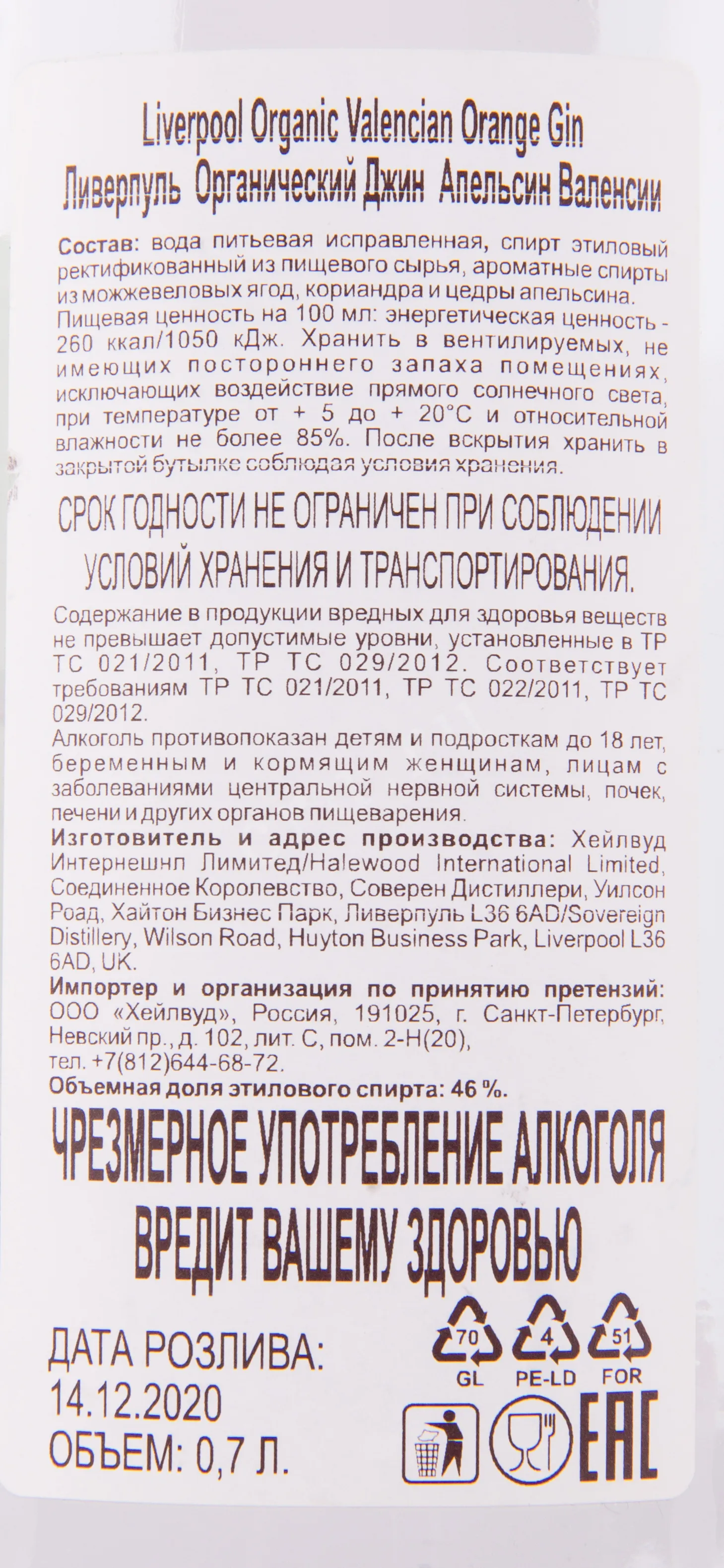 Liverpool Organic Valencian & Orange 0.7 л купить - Джин Ливерпуль Органический Апельсин Валенсии цена в магазине КРЮ ПРОФИ
