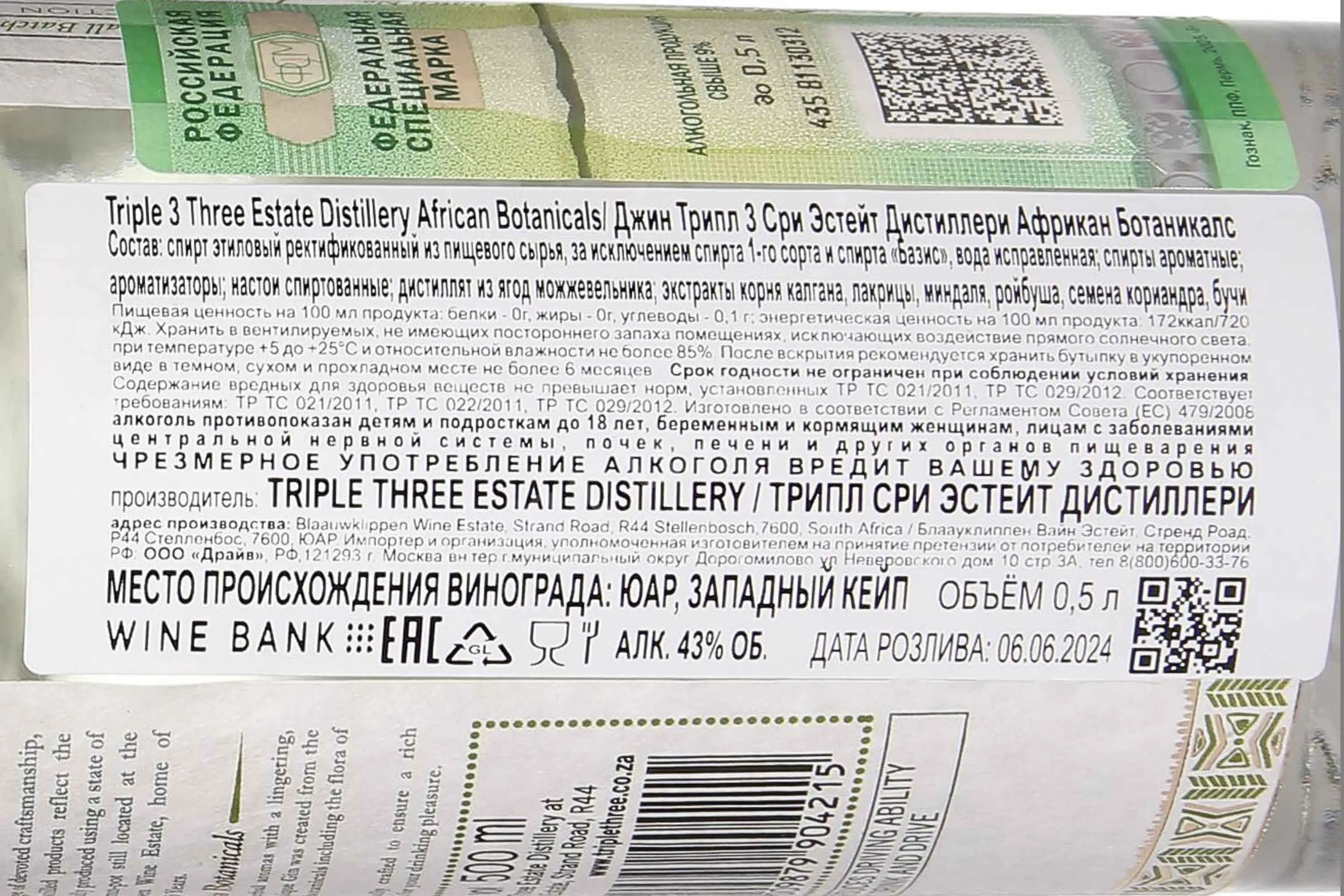 Джин Triple Three African Botanicals 0,5 л создан в Южной Африке и отражает стиль локальной дистилляции с акцентом на уникальные растения континента. Производится маленькими партиями, что позволяет максимально контролировать качество. В его основе классическая зерновая спиртовая база, к которой добавлены африканские травы, специи и коренья. Для дистилляции используют медные кубы небольшого объема. Джин выделяется чистотой и сбалансированным характером, в котором традиционные ноты можжевельника сочетаются с экзотическими оттенками африканской флоры. Этот напиток получил положительные отзывы экспертов за свежесть и глубину и был отмечен престижными наградами, среди которых золотые медали конкурсов Michelangelo International Wine & Spirits Awards, San Francisco World Spirits Competition и др.