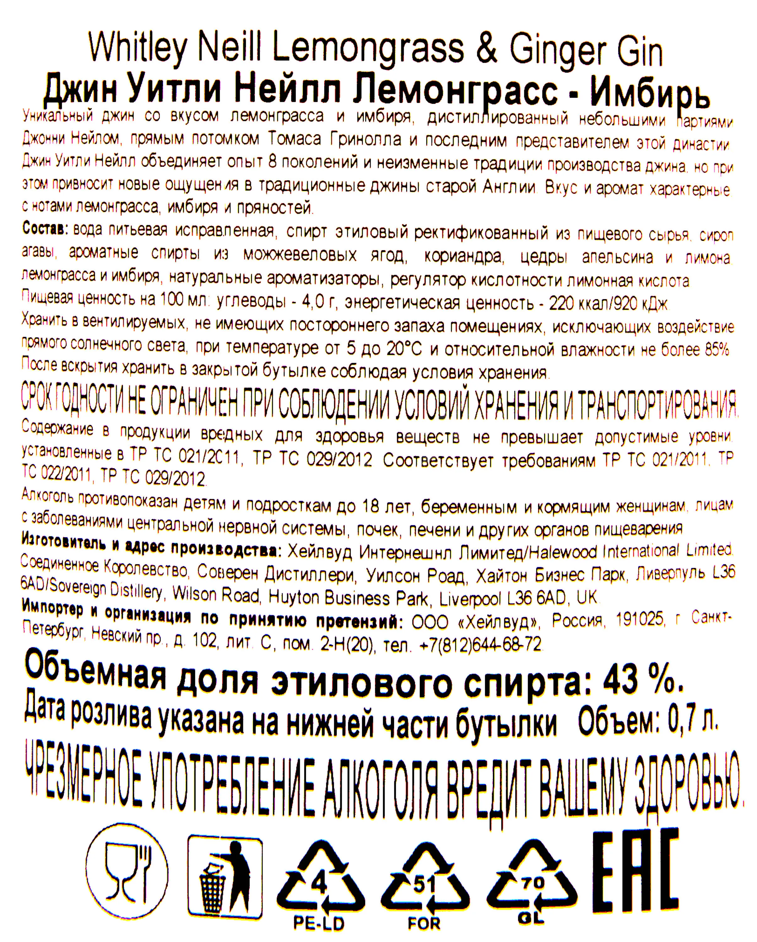 Whitley Neill Lemongrass & Ginger 43 0.7 л купить - Джин Уитли Нилл Лемонграсс и Имбирь 43 цена в магазине КРЮ ПРОФИг. Москва, ул. Профсоюзная, д. 16/1010:00-22:00 Ежедневно+7 (495) 920-20-02info@cru.ru