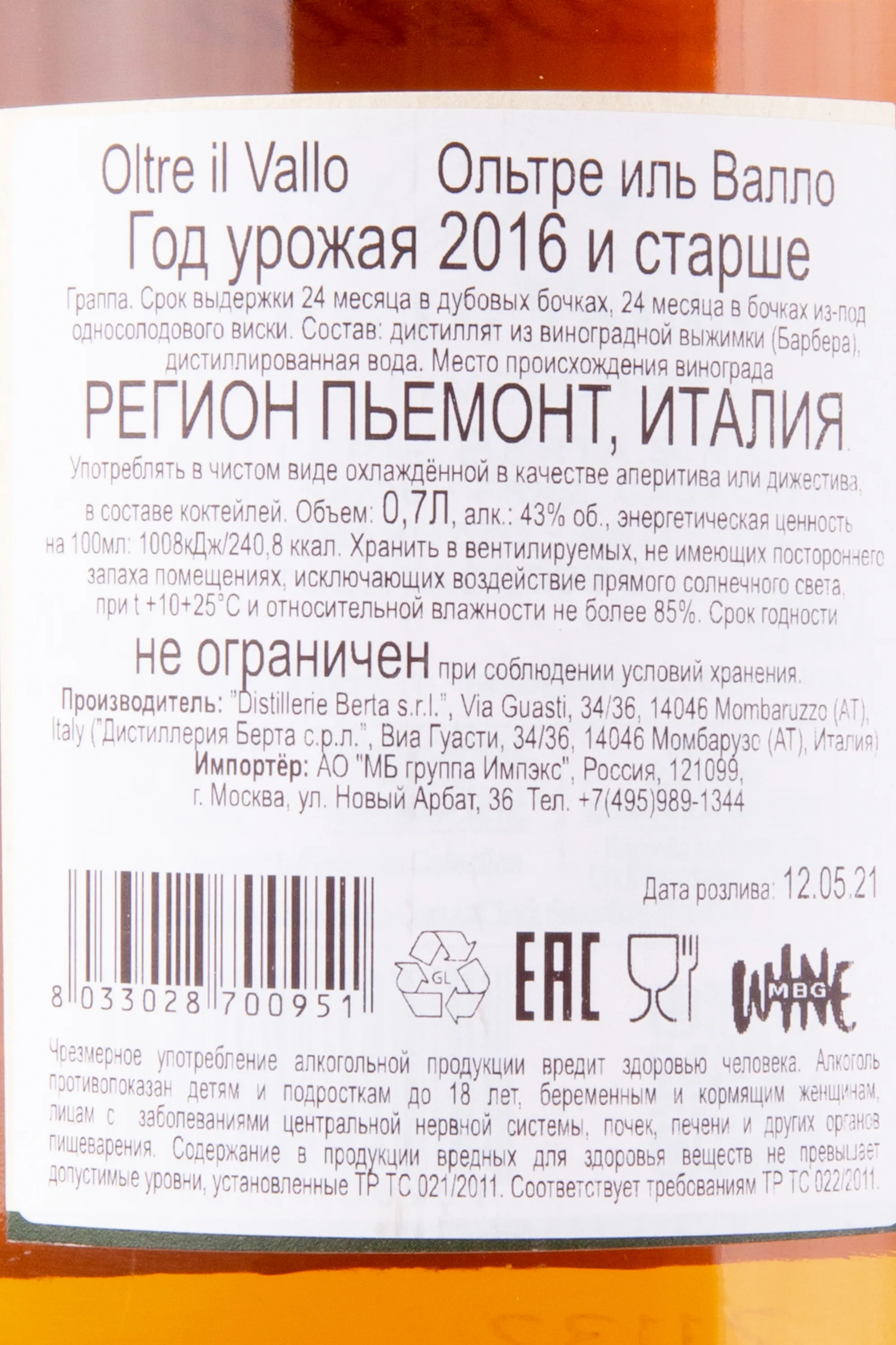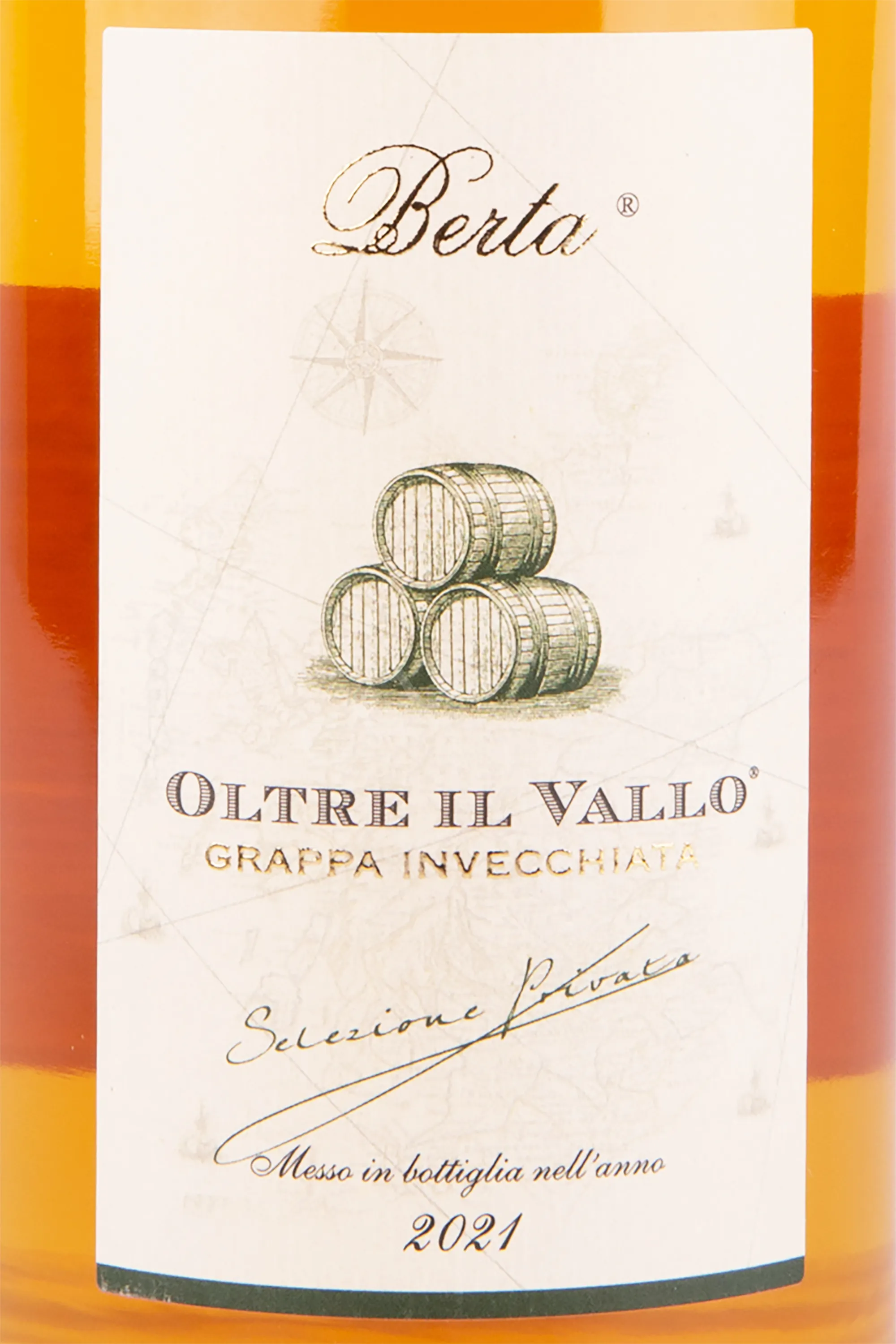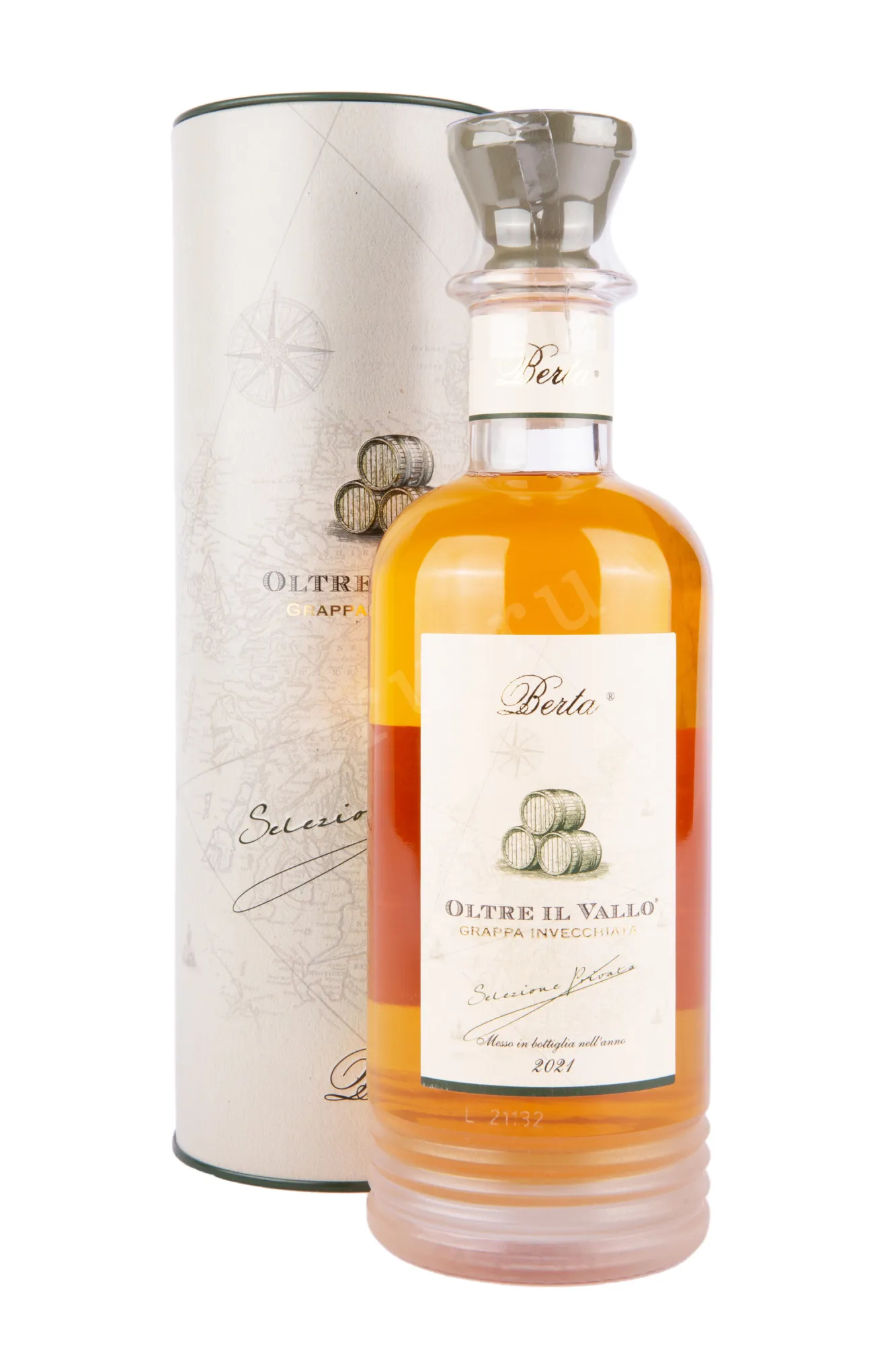 Граппа Berta Oltre il Vallo in tube 0.7 л была создана из тщательно отобранных выжимок винограда, собранного в регионе Пьемонт, известном своими холмистыми ландшафтами и богатыми известняковыми почвами. После традиционной перегонки напиток два года выдерживали в дубовых бочках, ранее использованных для созревания шотландского виски, а также классических новых дубовых емкостях. Такая технология придала граппе уникальные черты и сложность вкусовых оттенков. Этот напиток 43-градусной крепости продается в красивом графине и дополняется боксом-тубой.