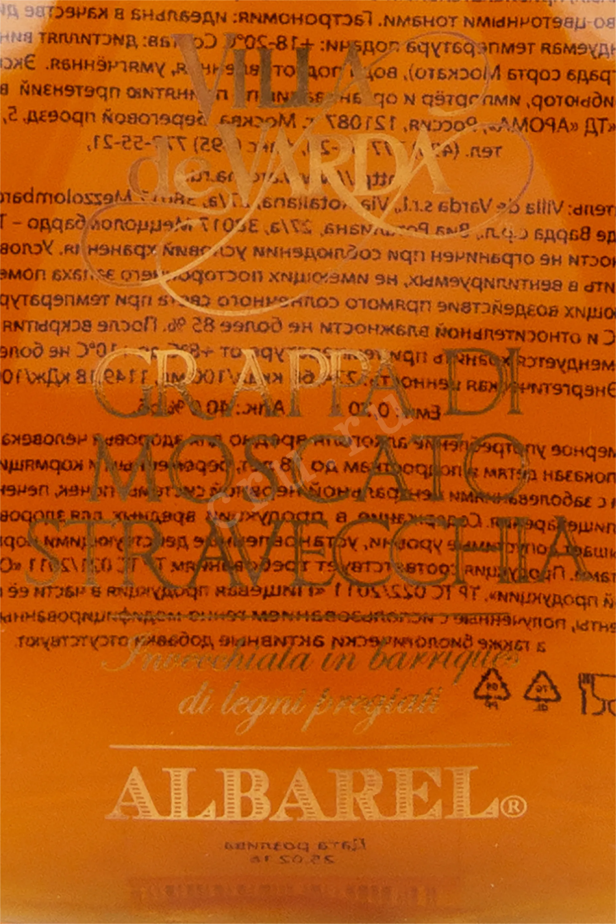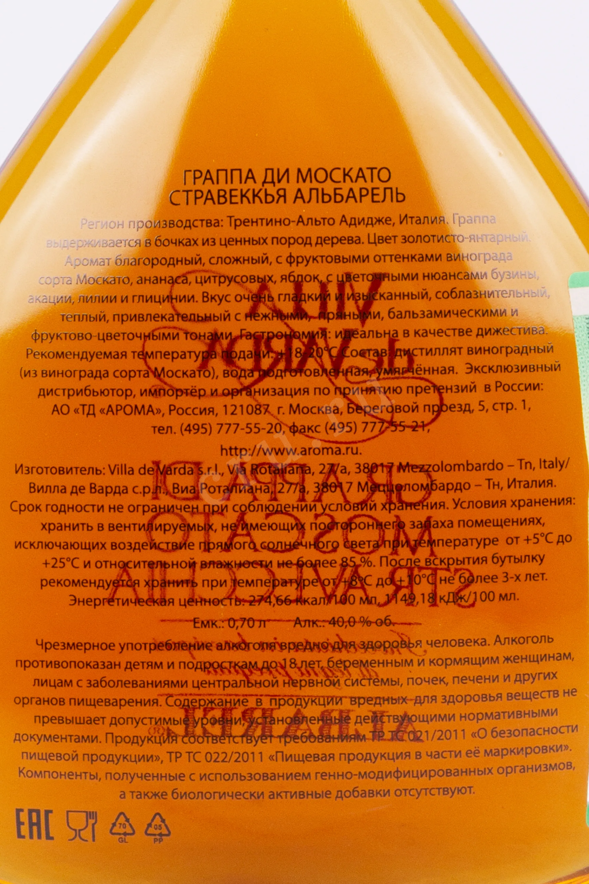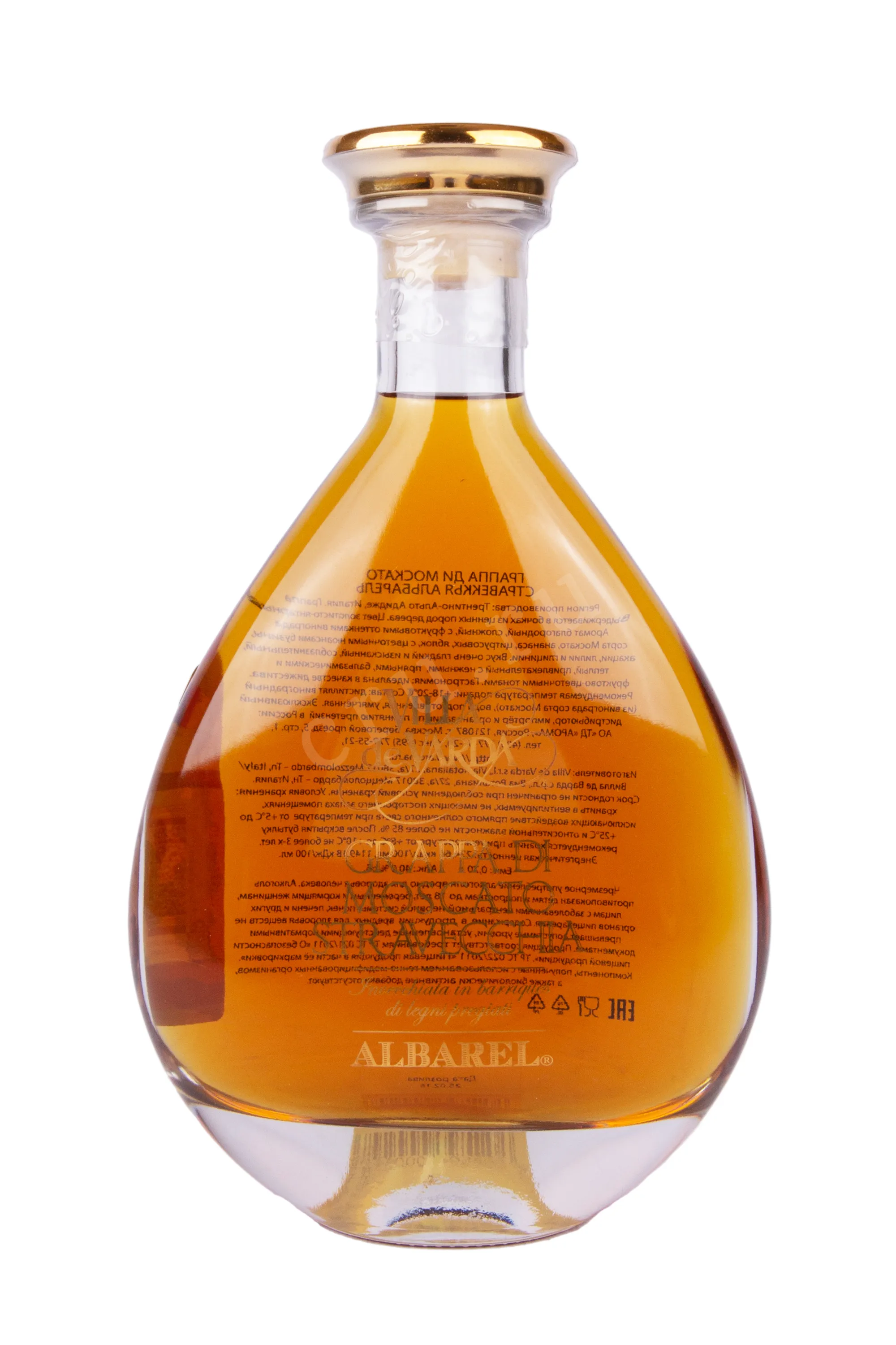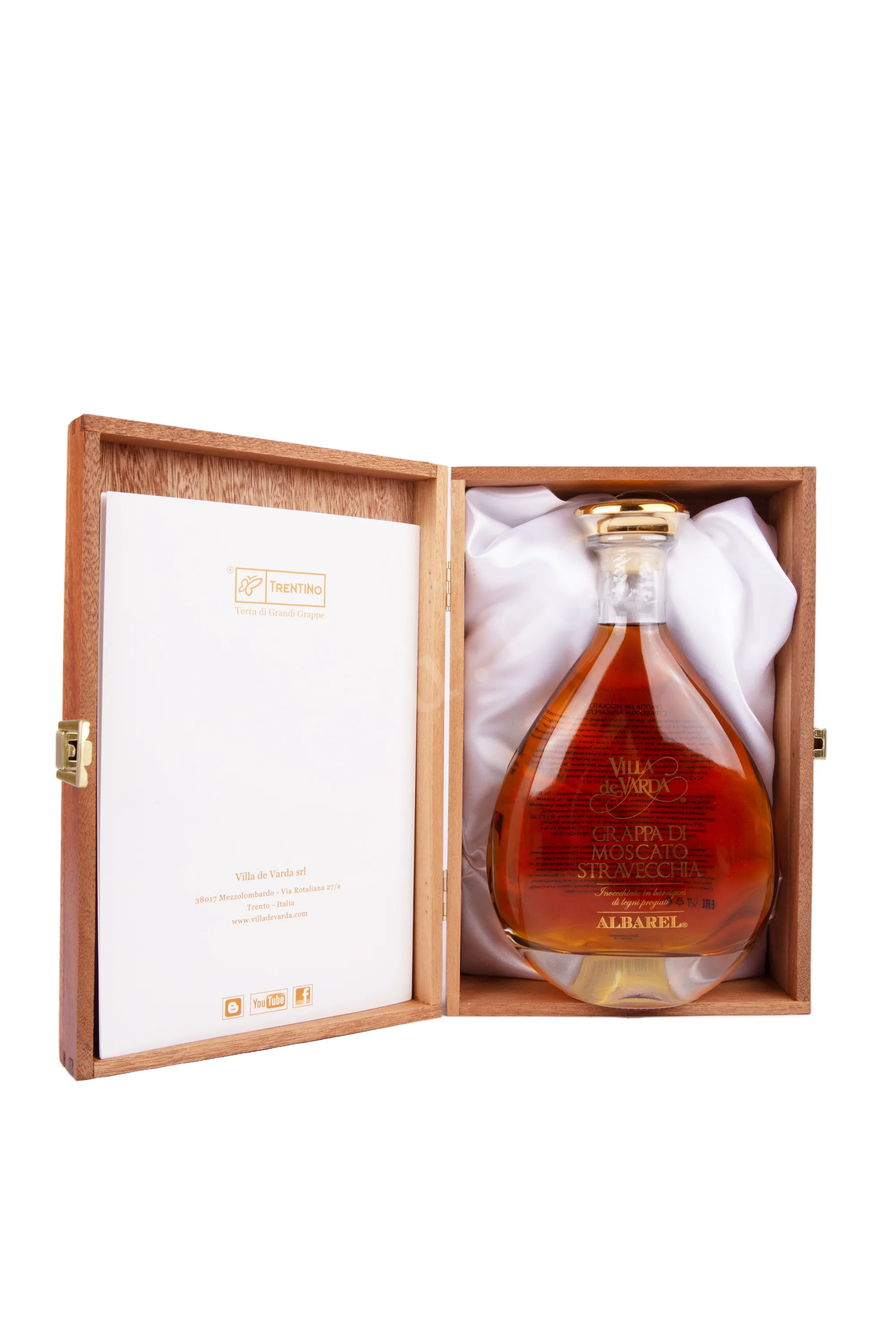 Граппа Villa de Varda di Moscato Stravecchia Albarel wooden box 0.7 л создана из виноградного жмыха ароматного сорта Москато, выращенного в долине Валь-ди-Чембра региона Трентино, известной своим уникальным горным терруаром и резкими перепадами температур. Сбор винограда происходил вручную, после чего последовала аккуратная дистилляция традиционным методом в медных перегонных кубах. Полученный спирт выдерживался в дубовых бочках из особого сорта древесины Альбарель на протяжении как минимум трёх лет, благодаря чему напиток приобрёл интенсивный вкус.