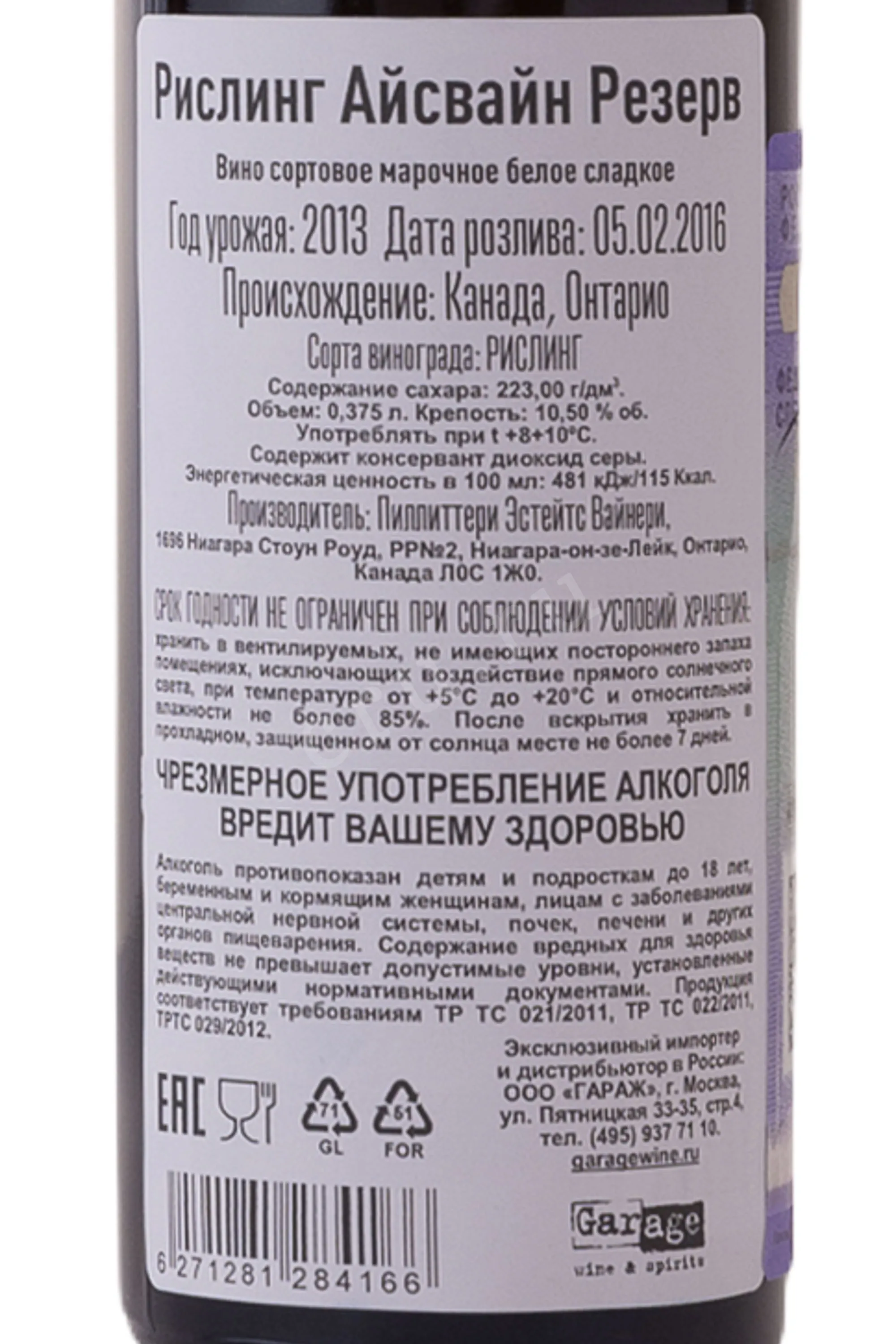 Айсвайн Pillitteri Reserve Riesling в подарочной упаковке 2013 года 0.375 л — канадское десертное вино с уникальным вкусоароматическим профилем, которое делают из замерзшего на лозе винограда. Его собирают на виноградниках в апелласьоне VQA Niagara-on-the-Lake, одном из ключевых регионов айсвайна в Канаде. Сорт Рислинг здесь выращивается в терруаре с прохладным климатом и долгой осенью, что позволяет ягодам полностью созреть и сохранить высокую кислотность. 2013 года считается удачным: стабильная погода и уверенные морозы обеспечили качественное естественное промерзание ягод на лозе. Сбор урожая осуществлялся вручную при низкой температуре. Ферментация протекала медленно с постоянным контролем и сохранением природной сладости. Для выдержки использовались стальные емкости. Уникальность айсвайна подтверждена престижной наградой Six Nations Wine Challenge. Подарочная упаковка подчеркивает статус вина и его коллекционную ценность.