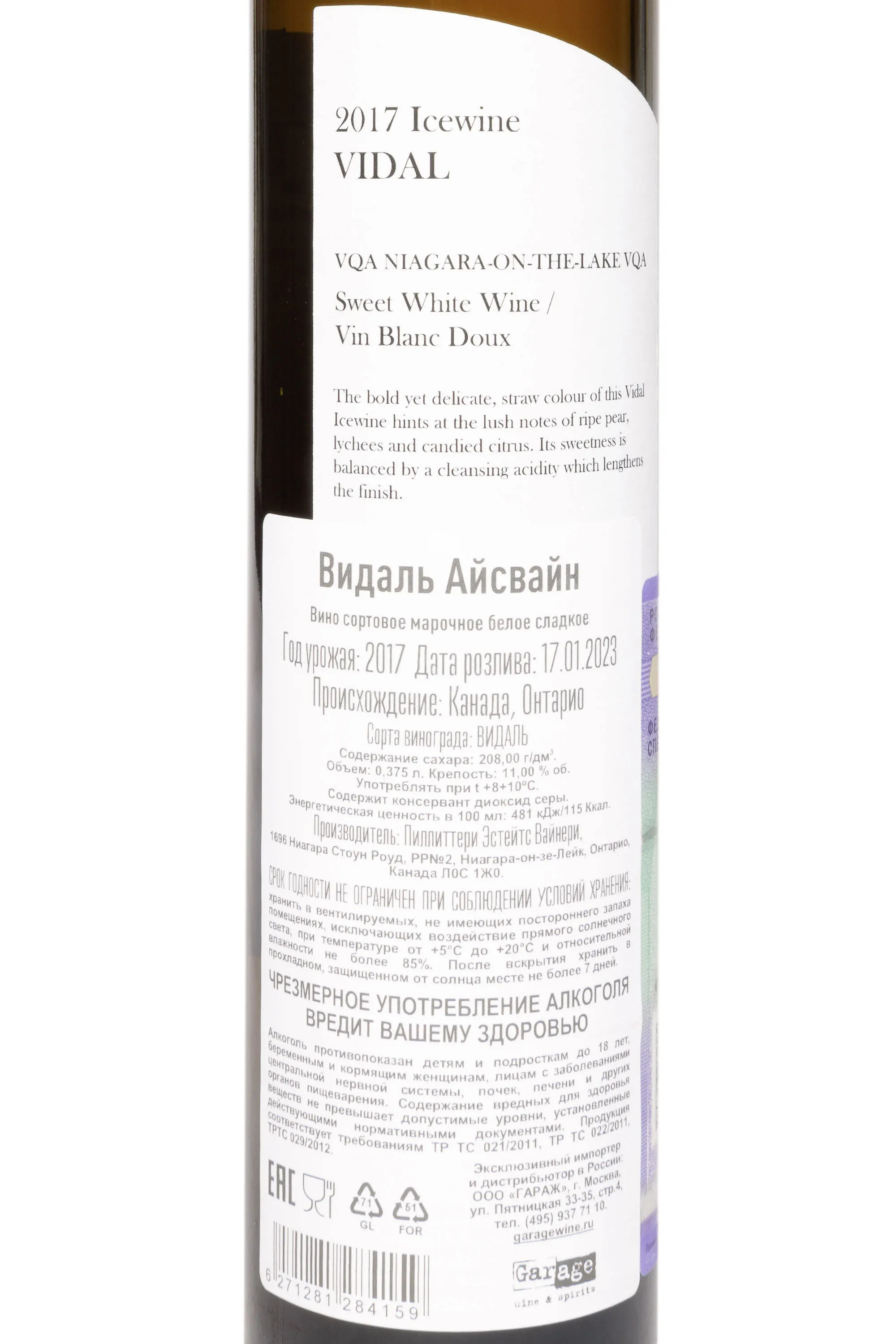 Айсвайн Pillitteri Vidal 2017 года 0,375 л представляет собой элегантное десертное белое вино с выраженной гармонией сладости и свежести. Виноград Видаль выращен в регионе Ниагарского полуострова, известного холодным климатом и каменистыми почвами, что идеально подходит для производства ледяных вин. Урожай 2017 года был благоприятным: холодные ночи и солнечные дни позволили ягодам достичь оптимальной концентрации сахаров и кислотности. Виноград подвергался заморозке на лозе, после чего тщательно прессовался, а ферментация проходила при низкой температуре, сохраняя фруктовые ароматы и чистую структуру. Вино недолго выдерживалось в нержавеющих резервуарах, что позволило ему сохранить яркость и свежесть. Оно высоко оценено критиками за баланс сладости и кислотности, входило в списки лучших айсвайнов Канады и завоевало несколько национальных наград за качество и чистоту вкуса. Потенциал хранения составляет до 30 лет.