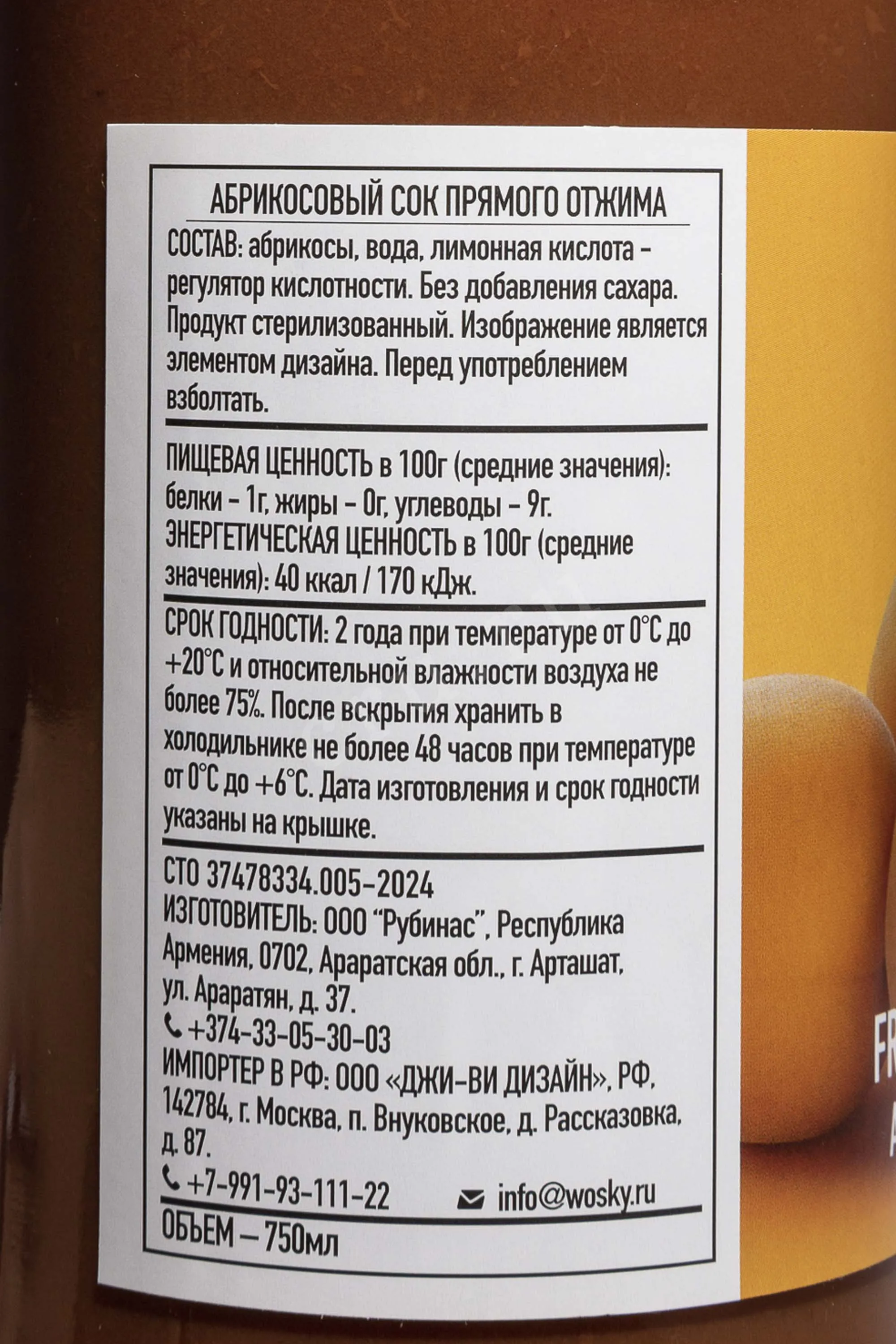 Сок Wosky Абрикосовый прямого отжима 0.75 л — фруктовый напиток с акцентом на природную чистоту вкуса и традиционный подход к переработке плодов. Производится в Армении исключительно из спелых абрикосов, без концентратов и искусственных добавок. Технология позволяет сохранить естественный состав и пищевую ценность плодов. Сок отличается густотой, мягкой текстурой и стабильным качеством. Натуральный вкус хорошо узнаваем. Напиток богат природными сахарами, органическими кислотами и витаминами. Он питательный и подходит для ежедневного употребления. Продукт стерилизован, что обеспечивает безопасность и сохранность вкуса. Разлит в стеклянную бутылку объемом 0.75 л, удобную для сервировки и хранения.