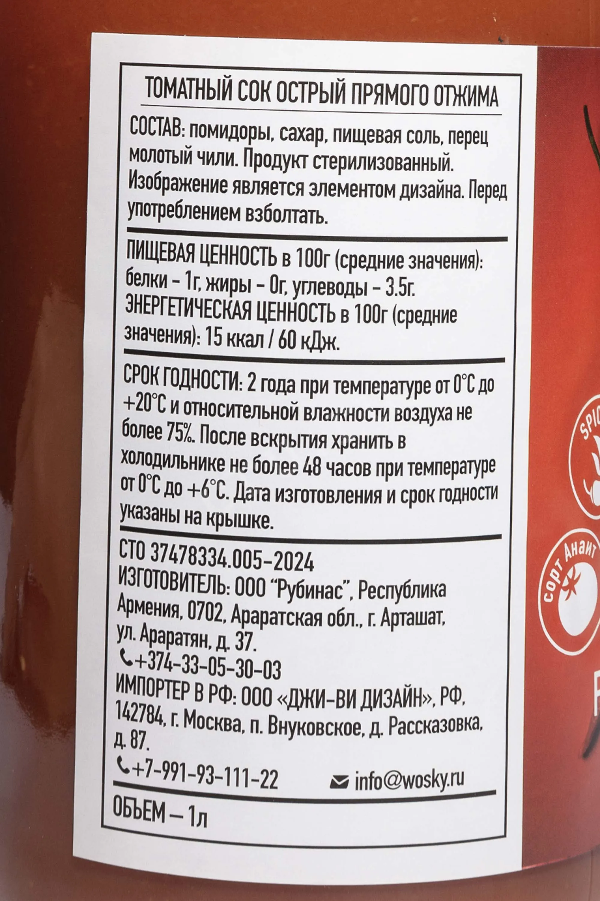Сок Wosky Томатный Острый 1 л — овощной напиток с ярким характером и выраженной пряной направленностью. Производится в Армении из спелых помидоров методом первого прямого отжима, что позволяет сохранить природную плотность и насыщенность вкуса. В состав входят помидоры, сахар, соль и перец чили. Рецептура простая и прозрачная. Острота сбалансированная, не подавляет томатную основу. Сок отличается натуральным составом и узнаваемым вкусом. Он богат полезными веществами, характерными для томатов. Хорошо утоляет жажду и подходит для повседневного употребления. Продукт стерилизован и разлит в удобную стеклянную бутылку.