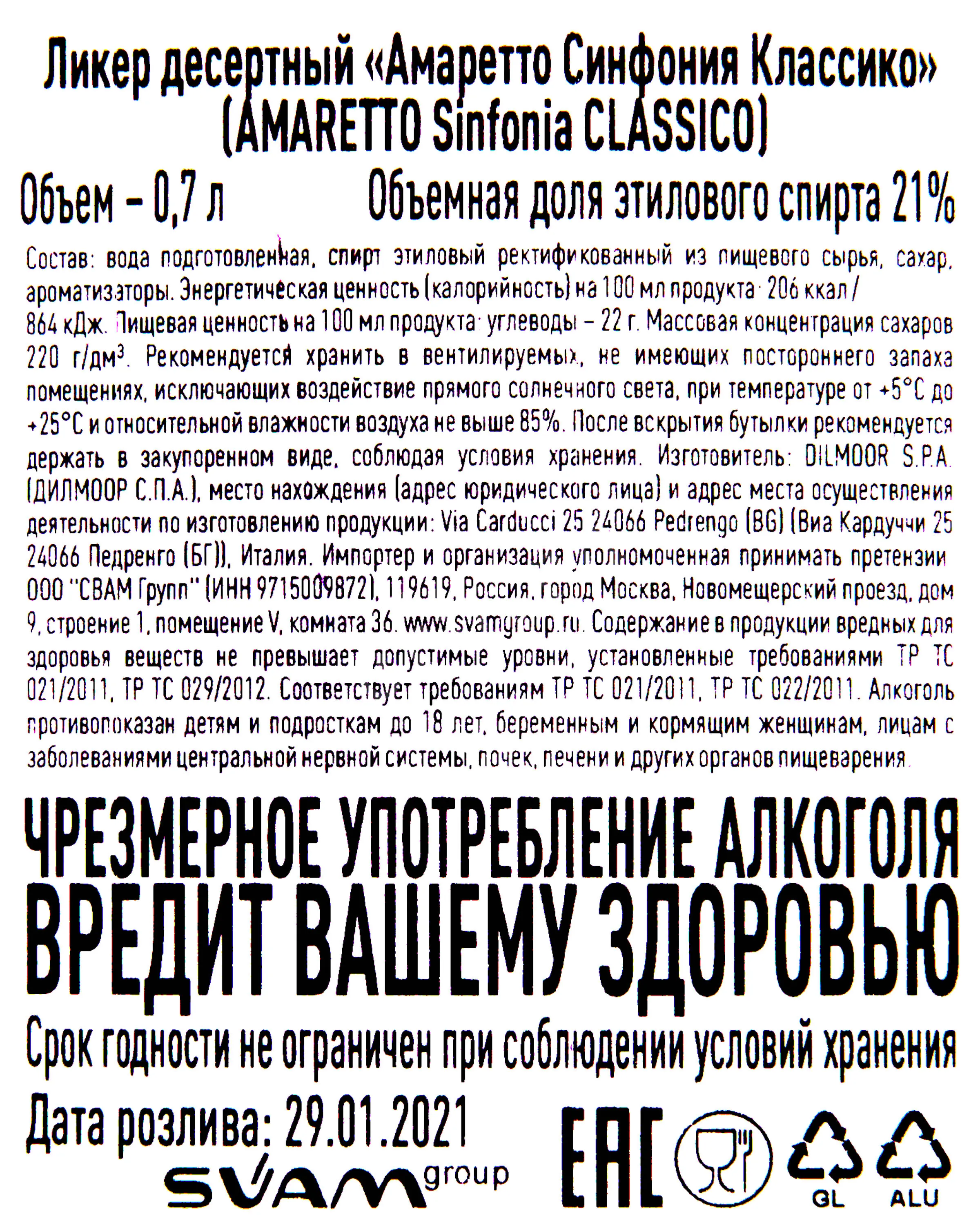 Amaretto Sinfonia Classico 0.7 л купить - Ликер Амаретто Синфония Классико цена в магазинег. Москва, ул. Профсоюзная, д. 16/1010:00-22:00 Ежедневно+7 (495) 920-20-02info@cru.ru