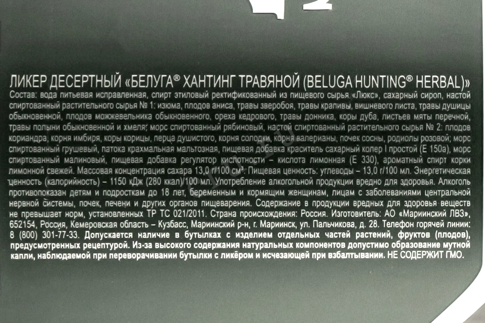 Ликер Beluga Hunting Herbal 0.7 l впервые был выпущен в 2015 году Мариинским ликеро-водочным заводом в категории алкогольных напитков класса премиум. Травяной ликер изготавливается с орехово-травяными добавками. В качестве особого знака принадлежности к бренду каждая бутылка выпускается с рыбкой белугой на этикетке. 40-процентный напиток имеет срок хранения 3 года.