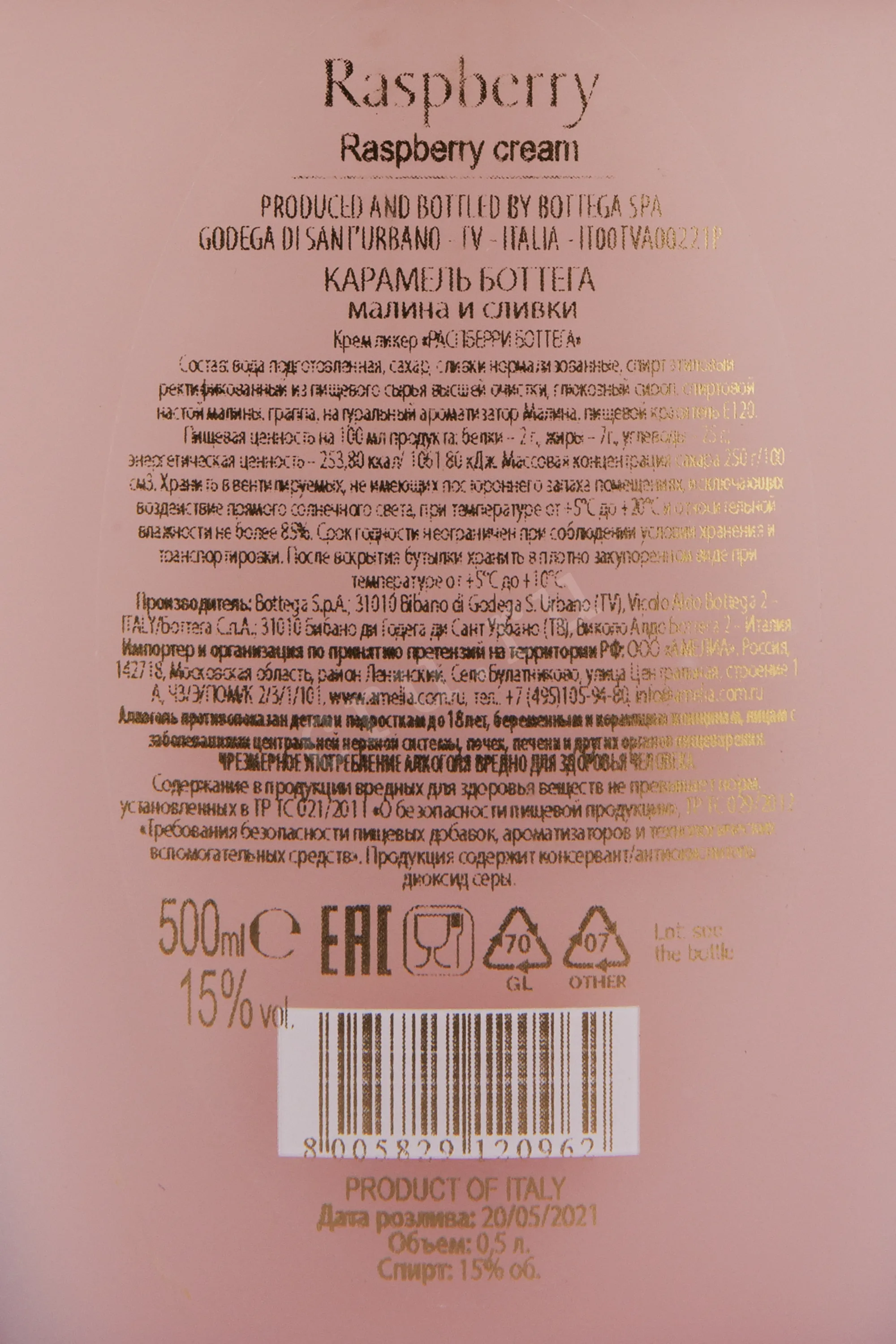 Ликер Bottega Raspberry 0.5 l – это итальянский алкоголь, который изготавливается на основе граппы, малинового экстракта и белого шоколада. Ягоды вымачиваются в чистейшем высококачественном спирте несколько дней, а после напиток перегоняется и смешивается со сладкими молочными сливками и граппой. 15-процентный ликер подается в высоком бокале-тумблере.