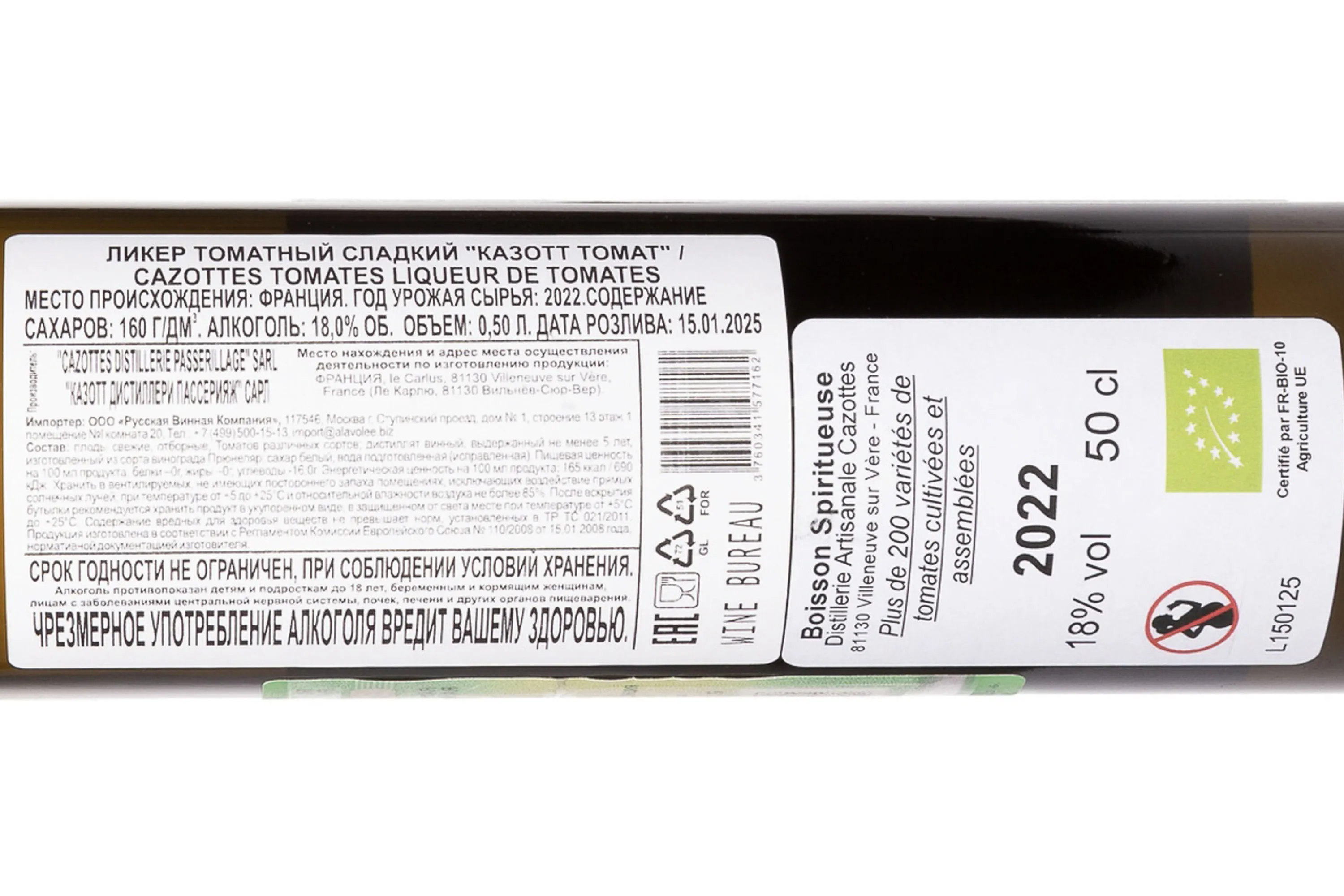Ликер Cazottes Tomates 0,5 л — необычный и редкий спиртной напиток, созданный во Франции мастером-дистиллятором Лораном Казоттом. Это крафтовый алкоголь, полностью основанный на натуральных ингредиентах и уникальной философии хозяйства, где выращивается более 200 сортов томатов. Среди них — «Золотой юбилей», «Чёрный Крым», «Бернская роза» и другие редкие разновидности. Томаты выращиваются без химии, среди сливовых деревьев и ароматных трав, что придаёт напитку особый характер. После сбора урожая помидоры нарезаются вручную и мацерируются в 5-летнем виноградном дистилляте из сорта Прюнеляр в течение 14 месяцев. Это создаёт сложный букет с балансом свежести, фруктов и землистых оттенков. Ликёр получил восторженные отзывы критиков за оригинальность и глубину вкуса и считается одним из лучших экспериментальных творений Казотта.