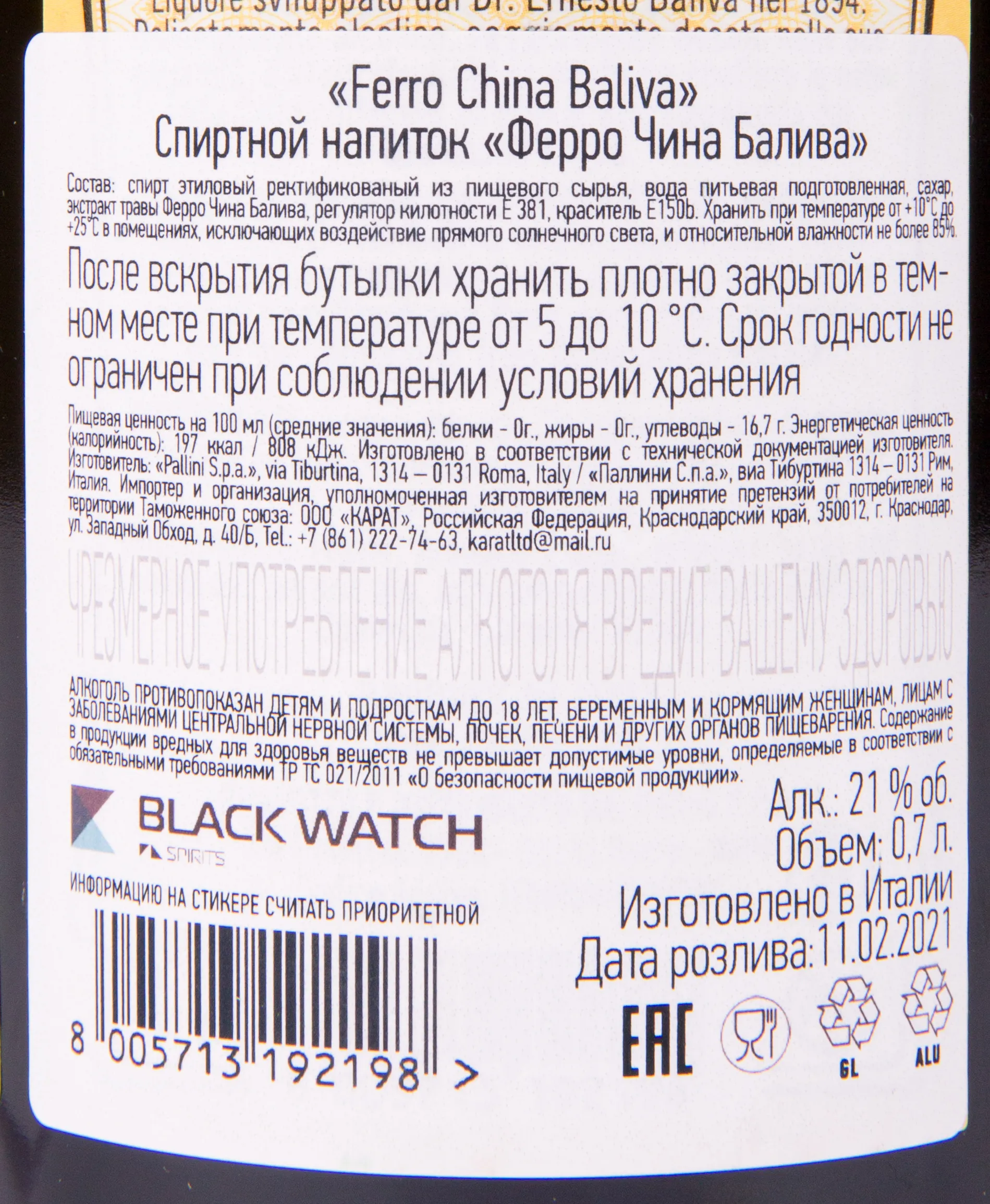 Ликер Ferro China Baliva Amaro 0.7 l – это итальянский десертный травяной напиток, созданный на основе экстракта коры и корней хинного дерева с добавлением железа. За время своего существования 21-процентный напиток был отмечен 8 золотыми медалями на конкурсах спиртного.