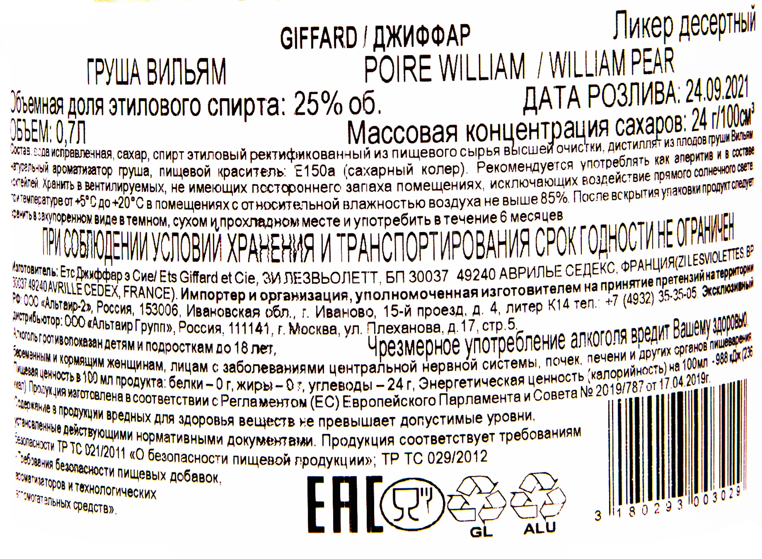 Giffard Poire William 0.7 л купить - Ликер Жиффар Груша Виллиам цена в магазине