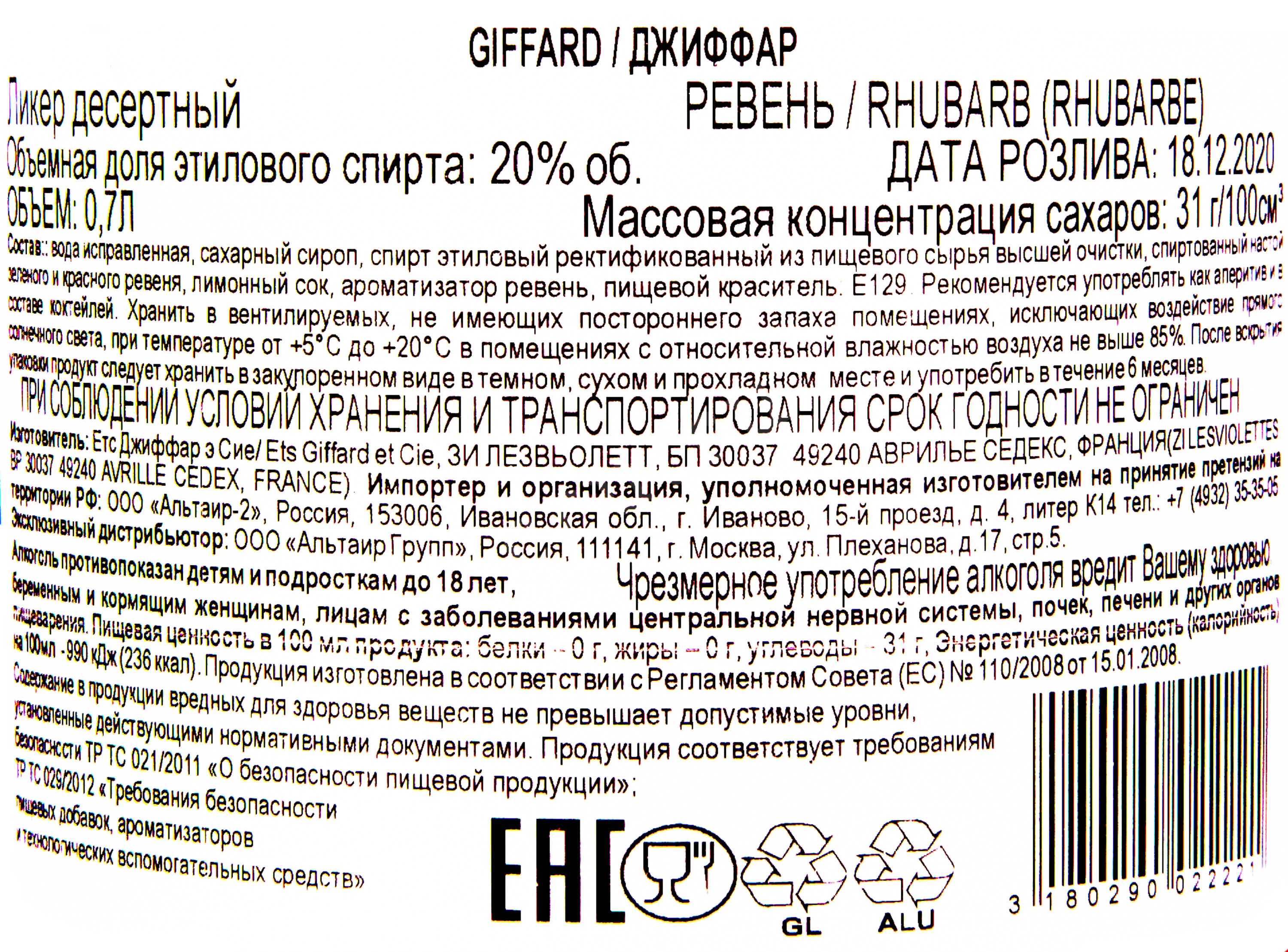 Giffard Rhebarbe 0.7 л купить - Ликер Жиффар Ревень цена в магазине