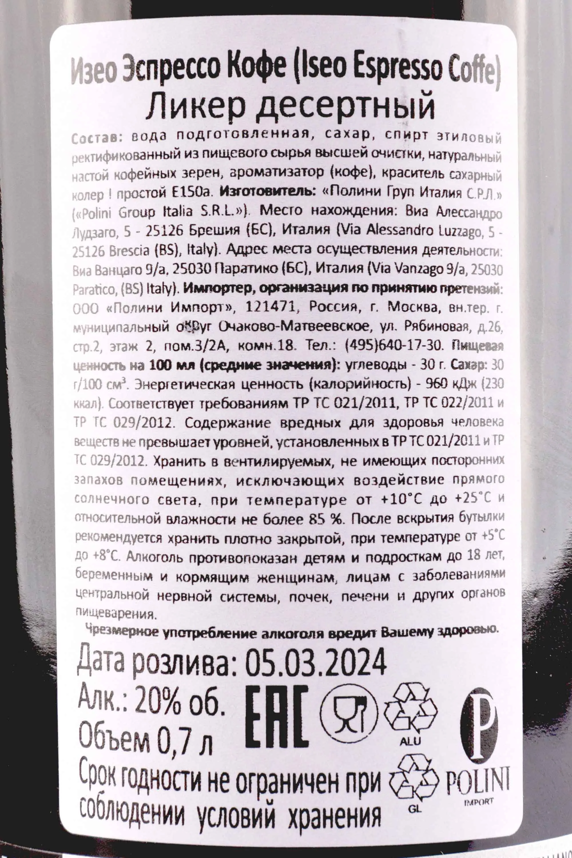 Ликер Iseo Espresso Coffee 0,7 л представляет собой кофейный спиртной напиток итальянского производства от компании Polini Group. Он изготовлен на основе ректификата и натуральных кофейных зёрен сорта Arabica. Кофе выращивают на высокогорных плантациях и обрабатывают методом холодного заваривания, что придаёт готовому купажу глубокий и насыщенный вкус. В процессе производства используют лёгкую фильтрацию. Отличительная особенность ликера — гармоничное сочетание кофейной горечи, умеренной сладости и мягкой текстуры. Крепость образца — 20%.
