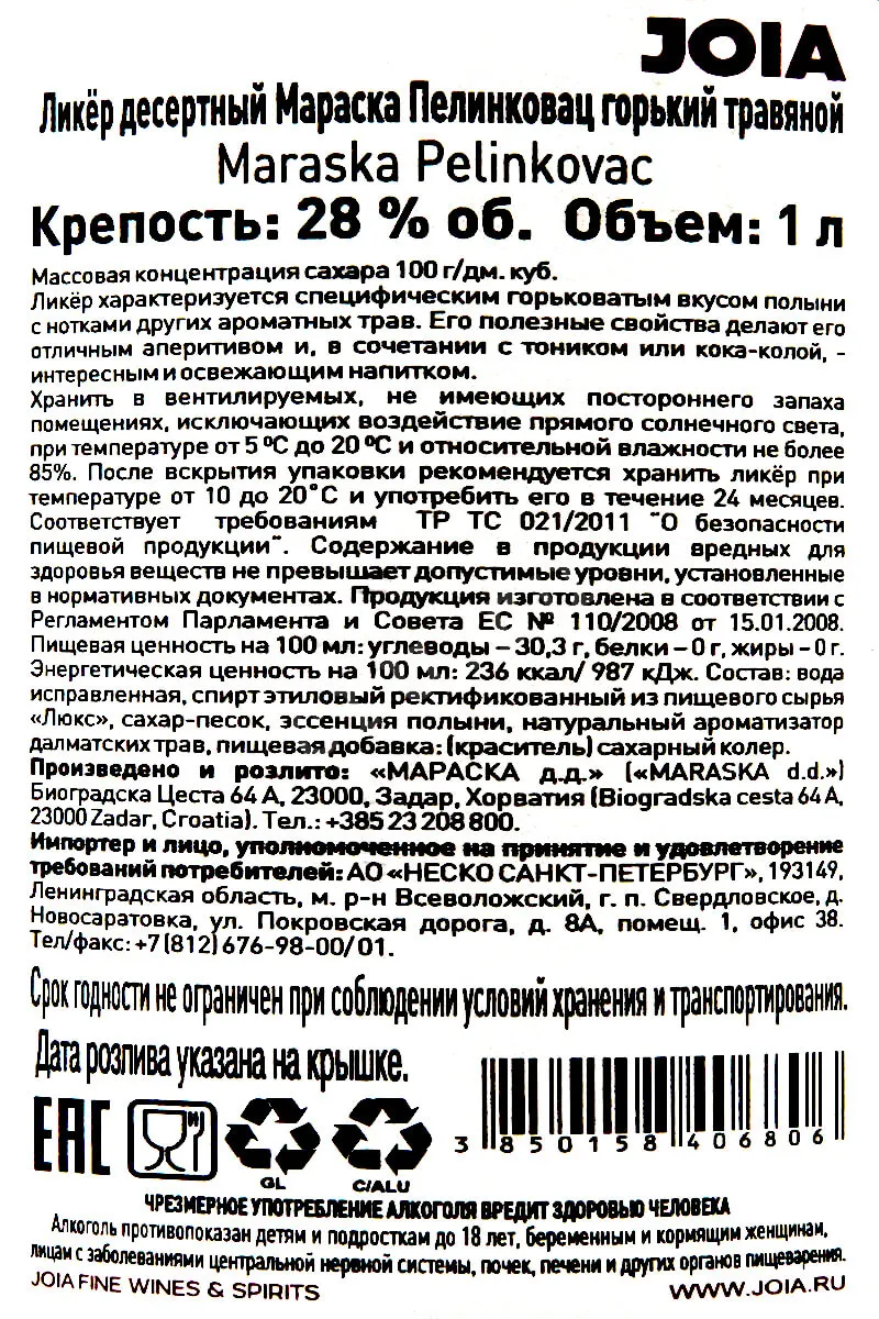 Marasca Pelinkovac Gorki Bilnji 1 л купить - Ликер Мараска Пелинковац Горький Травяной цена в магазине