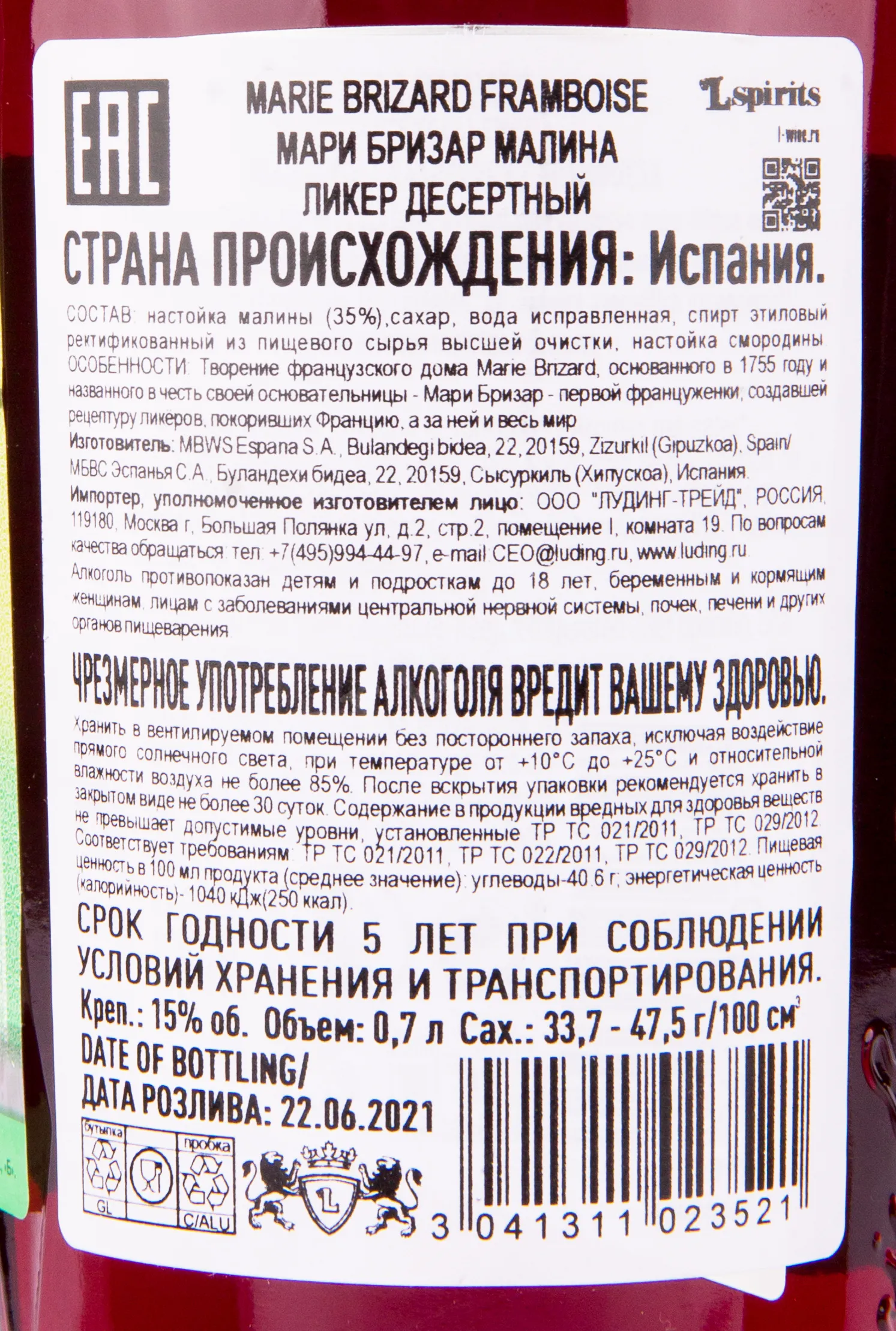 Ликер Marie Brizard Framboise 0,7 л — это ароматный напиток на основе спелой малины. Выпускается французским брендом, основанным в 1755 году. Для изготовления используют натуральную основу из ягод, выращенных в легендарном регионе Бургундия. В состав входят два сорта плодов — Rose de Plombières и Lloyd George, дополненные небольшим количеством экстрактов черной смородины. В производстве применяется традиционная технология мацерации ягод на спиртовой основе. Готовый купаж не содержит искусственных красителей. Ликер разлит в стеклянную бутылку объёмом 0,7 литра, выдержанную в классическом стиле бренда.