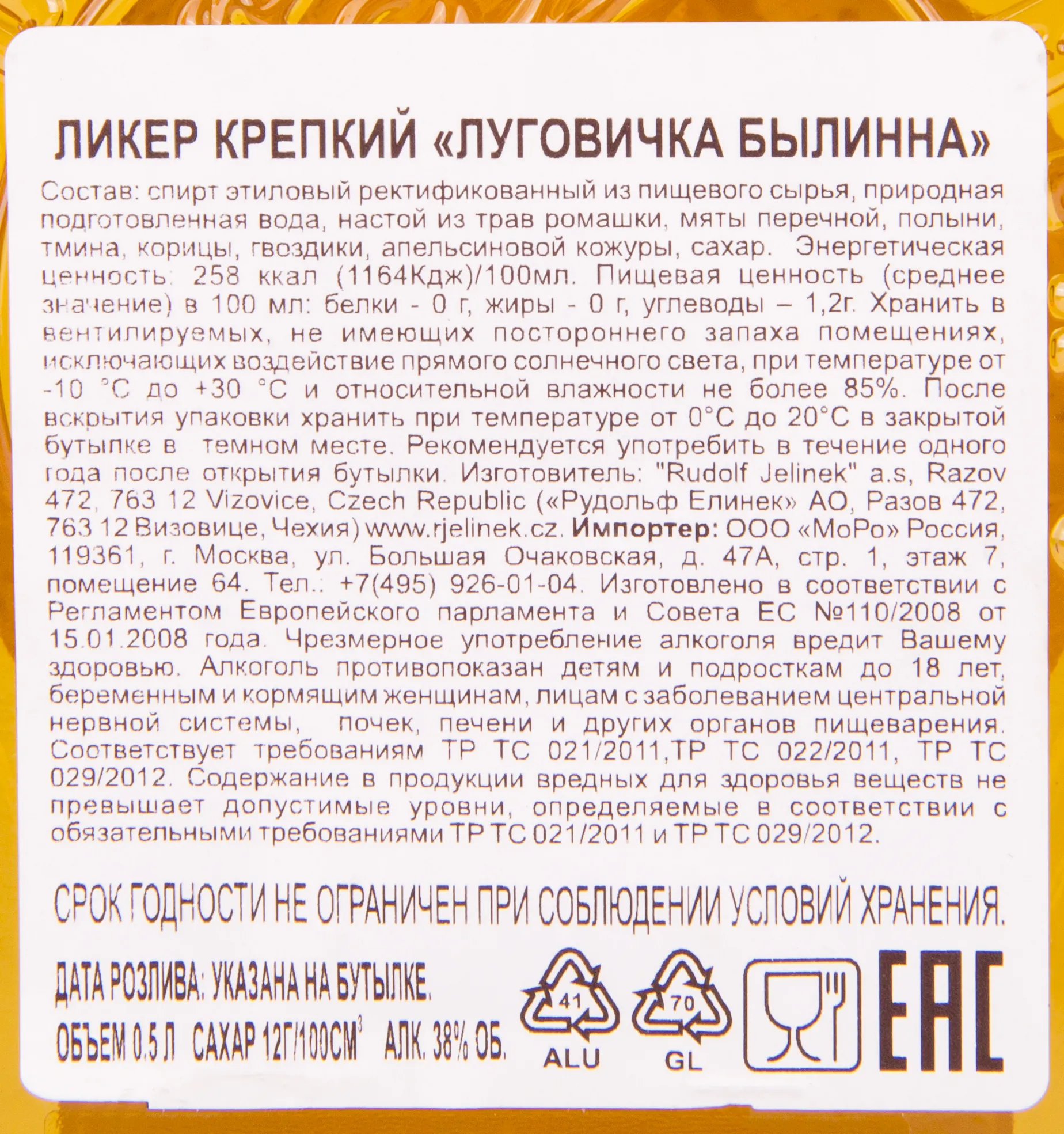 Ликер R. Jelinek Luhacovicka 0.5 l – это оригинальный чешский алкоголь, в изготовлении которого используется 13 растительных компонентов. В состав 38-процентного ликера входят дистилляты разнообразных трав и специй, таких как тмин, полынь, мята, ромашка, корица, гвоздика и др. Десертный напиток был отмечен золотой медалью на дегустационном конкурсе в Праге.