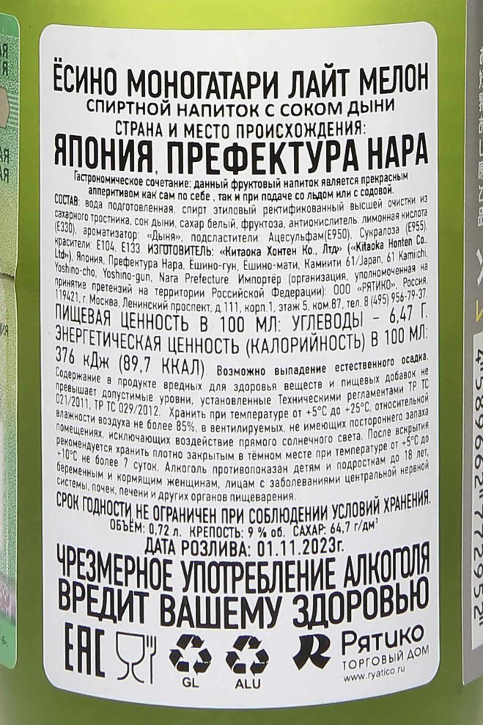 Ликер Yoshino Monogatari Light Melon 0,72 л создан в Японии и отражает традицию производства напитков с использованием натуральных фруктов. Он отличается легкой текстурой и невысокой крепостью, что делает его популярным среди ценителей мягких и освежающих вкусов. Основой служат тщательно отобранные дыни, придающие напитку характерную сладость и нежный узнаваемый оттенок. Производитель использует современные технологии в сочетании с классическими методами, благодаря чему удается сохранить яркий аромат и свежесть вкуса. Уникальность ликера в том, что он сочетает аутентичность характера, традиционное японское внимание к деталям и черты современного стиля.